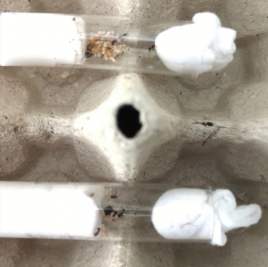 Chez les Tetramorium sp., le nourrissage en tube ne pose aucun souci. Lorsque j'ouvre le tube, elles reculent auprès de leur gyne, et protègent le couvain.