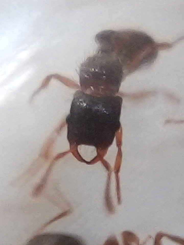 Surprise ! Thorax imposant, cicatrices alaires, j'ai affaire à une gyne. Vue la taille et l'allure générale, je pense d'abord à une gyne Myrmecina sp., même si je remarque tout de suite sa tête carrée et ses mandibules imposantes.