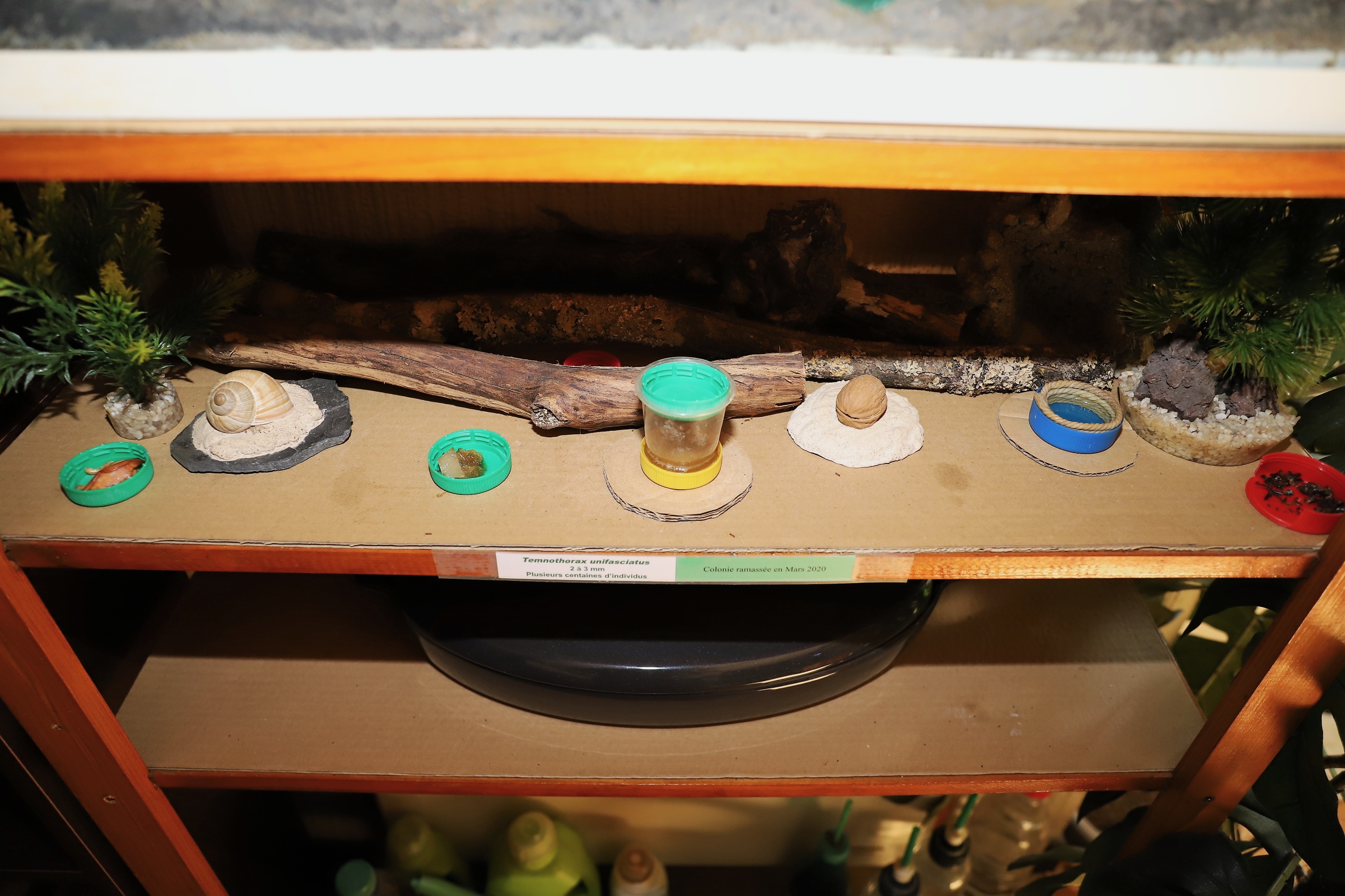 Je suppose que le gros de la troupe s'est réfugié autour de sa reine, Miss Johanna, sous l'écorce de pin noir visible entre le caillou et le bouchon vert qui est retourné avec de la nourriture dedans pour servir de piège aux collemboles ayant tendance à pulluler.