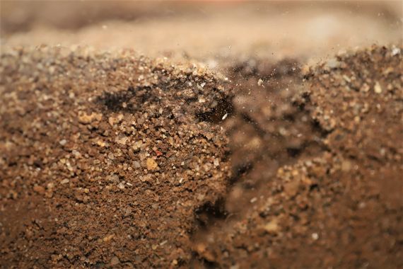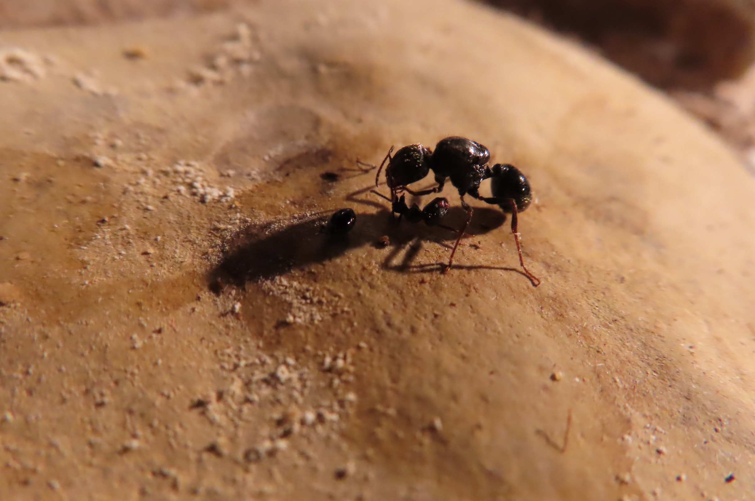 La terre du biorama de mes grosses fourmis bicolores devient assez grasse lorsqu'elle est raisonnablement humidifiée, donc collante, ce qui leur permet d'y creuser naturellement des chambres et galeries sans que les plafonds s'effritent ou leur tombent sur la tête. Contre la vitre de façade (1ère image) on peut voir deux tunnels rejoindre la surface, à gauche puis à droite, et sous le caillou blanc une loge dans laquelle une poignée d'ouvrières se font des câlins.