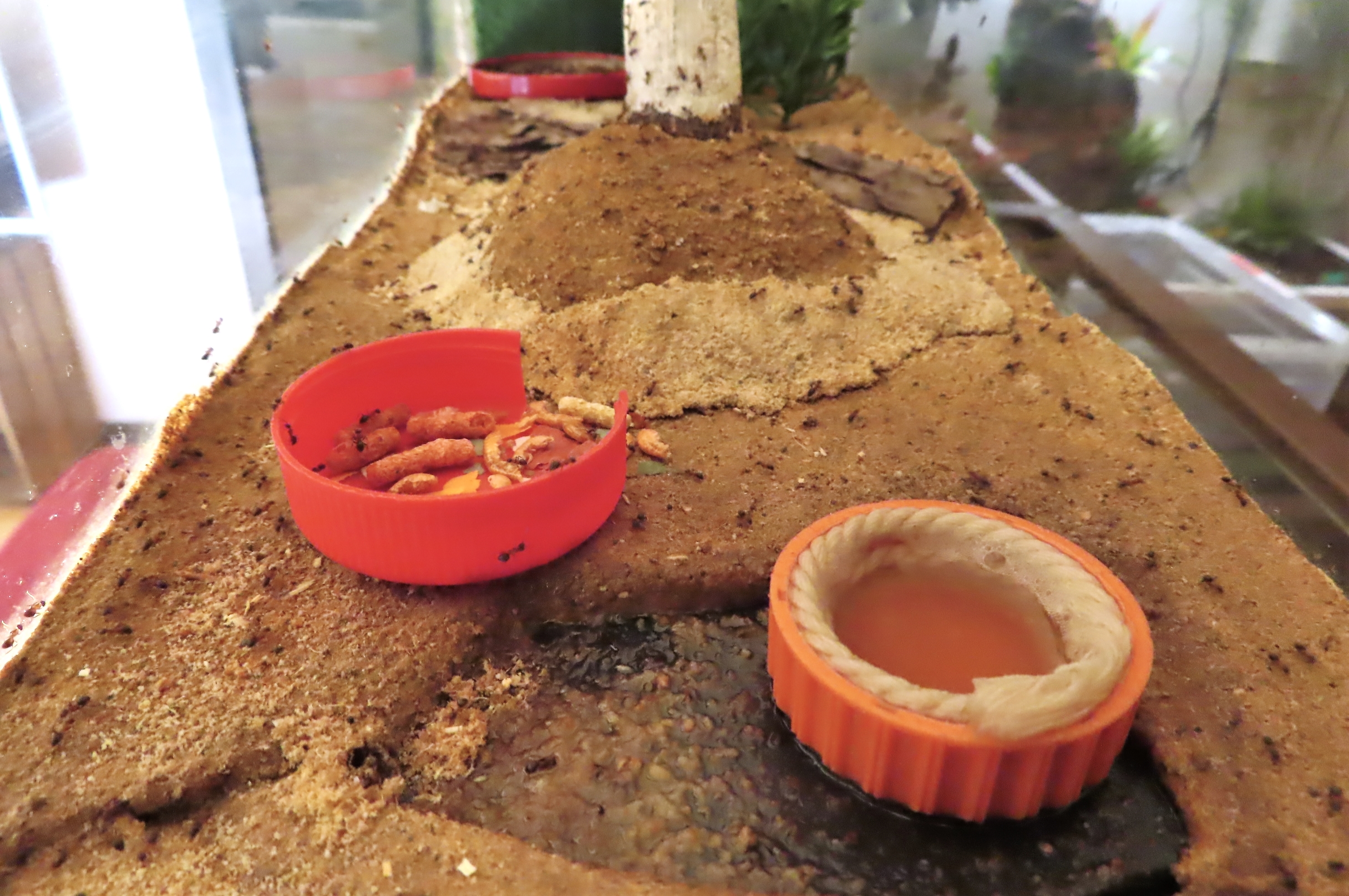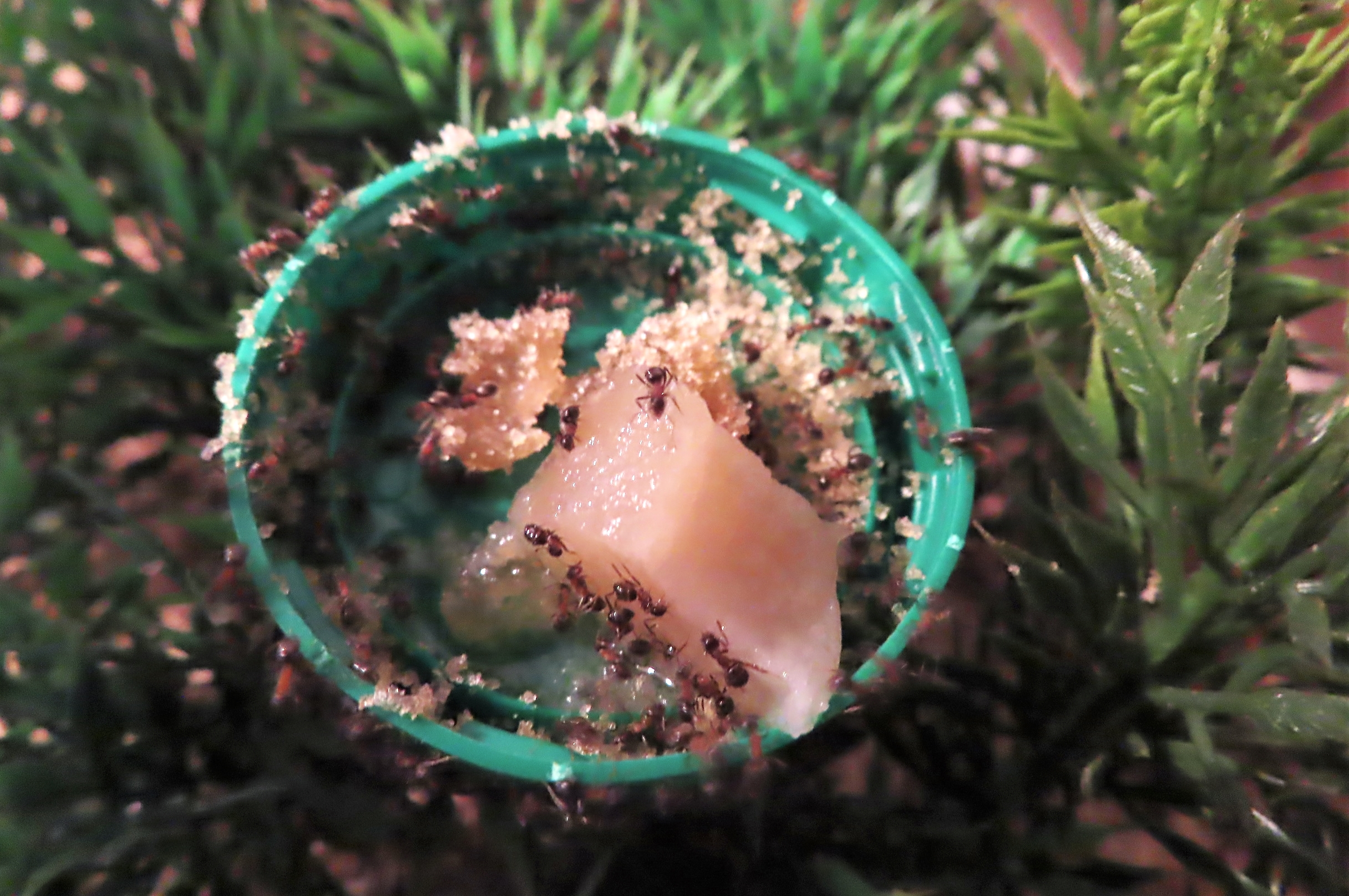 La nourriture est abondante et changée tous les deux ou trois jours : 2 bouchons de Bhatkar ; deux couvercles d'insectes décongelés coupés en morceaux ; un bouchon de pseudo miellat, et un grand bouchon rempli d'eau.