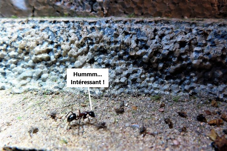 Mon excursion ayant duré pas mal de temps pour glaner tout ça puis pour revenir au bercail avec un cabas à roulettes rempli d'environ 50 Kg de débris de maçonnerie, je me suis dès mon retour attelé à la tâche sur ma terrasse pour rincer et brosser cette hétéroclite déchetterie à la pomme d'arrosage. C'est en faisant des navettes entre la salle de bain et ma terrasse que je vis ceci autour de l'entrée du nid de mes camponotes ronge-bois...