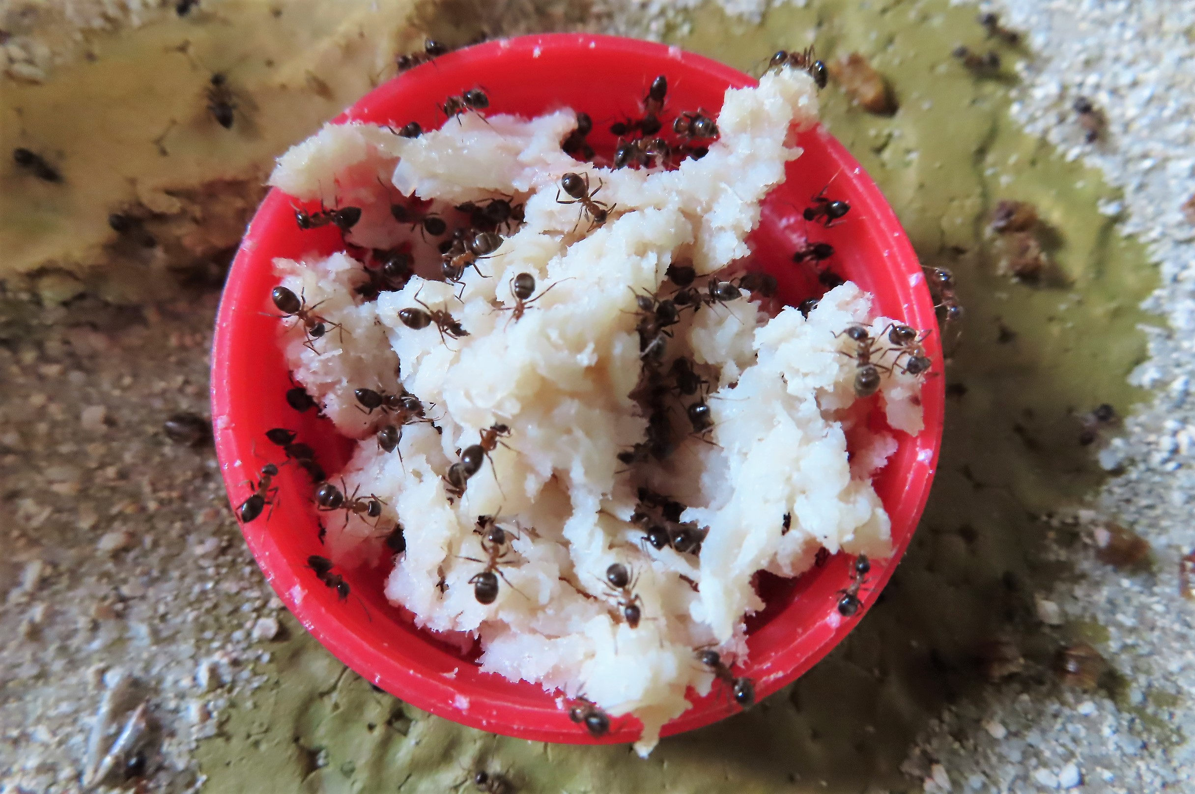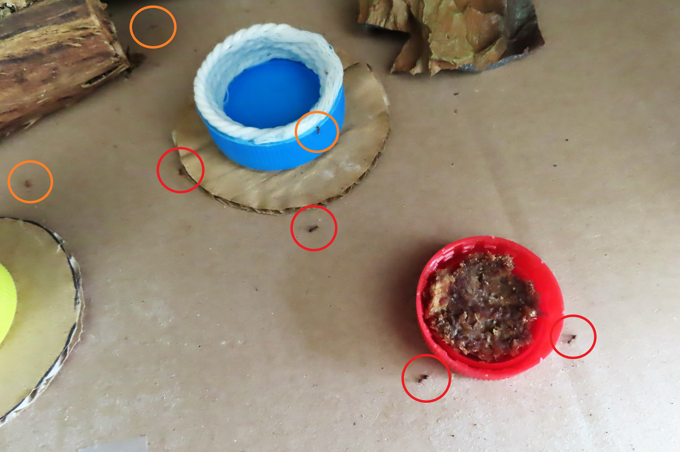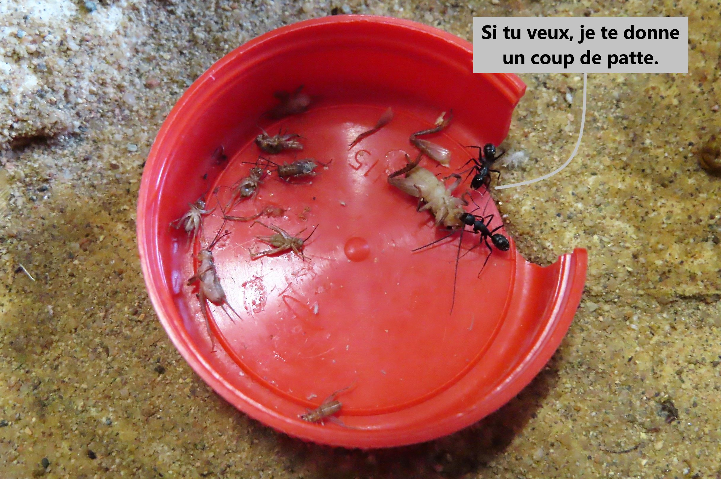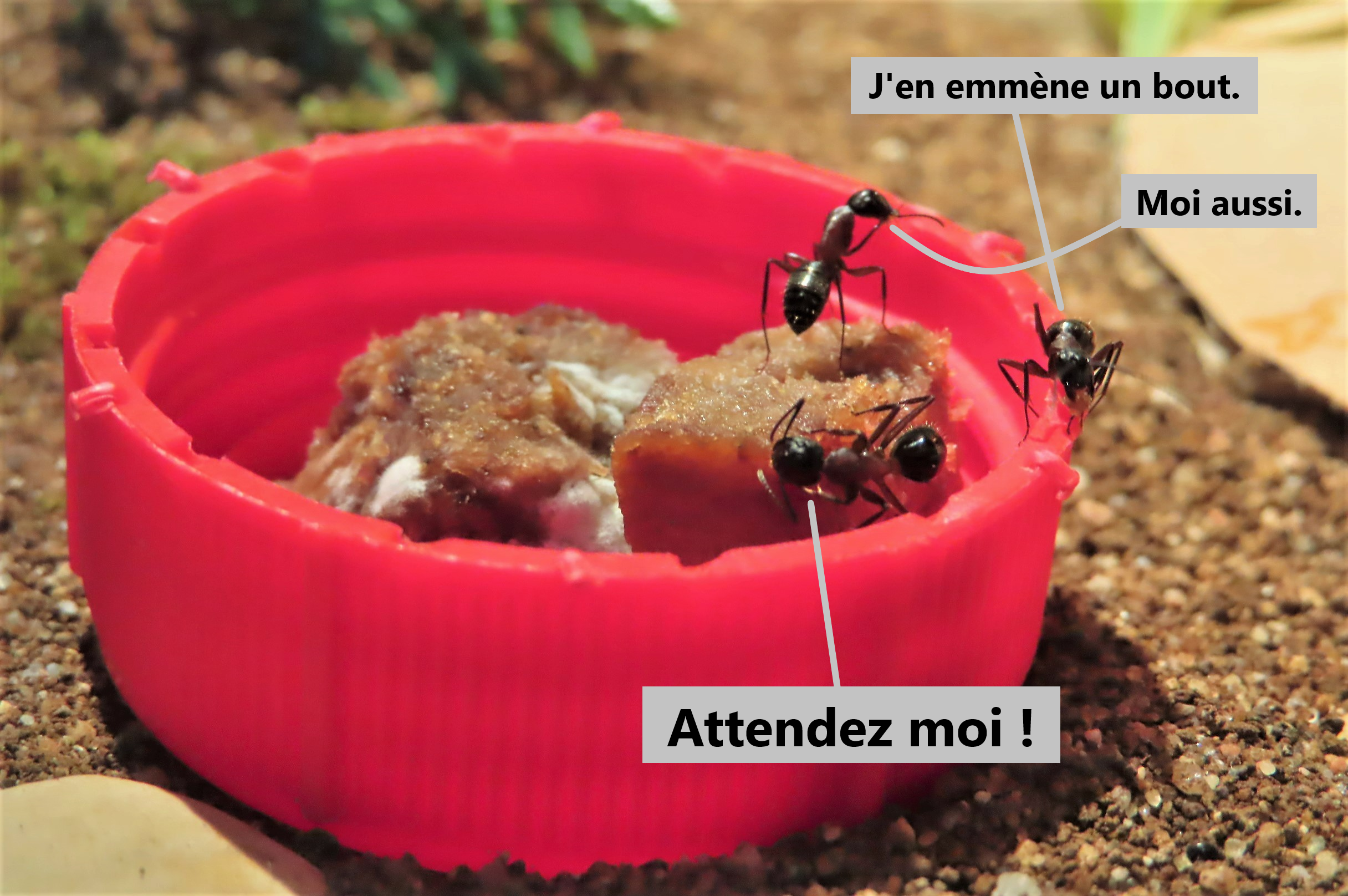 Lasius emarginatus se sont ruées vers le bouchon rouge en "phéromonant" : « Y'a un nouveau resto qui vient d'ouvrir ! Y'a un nouveau resto qui vient d'ouvrir ! ».