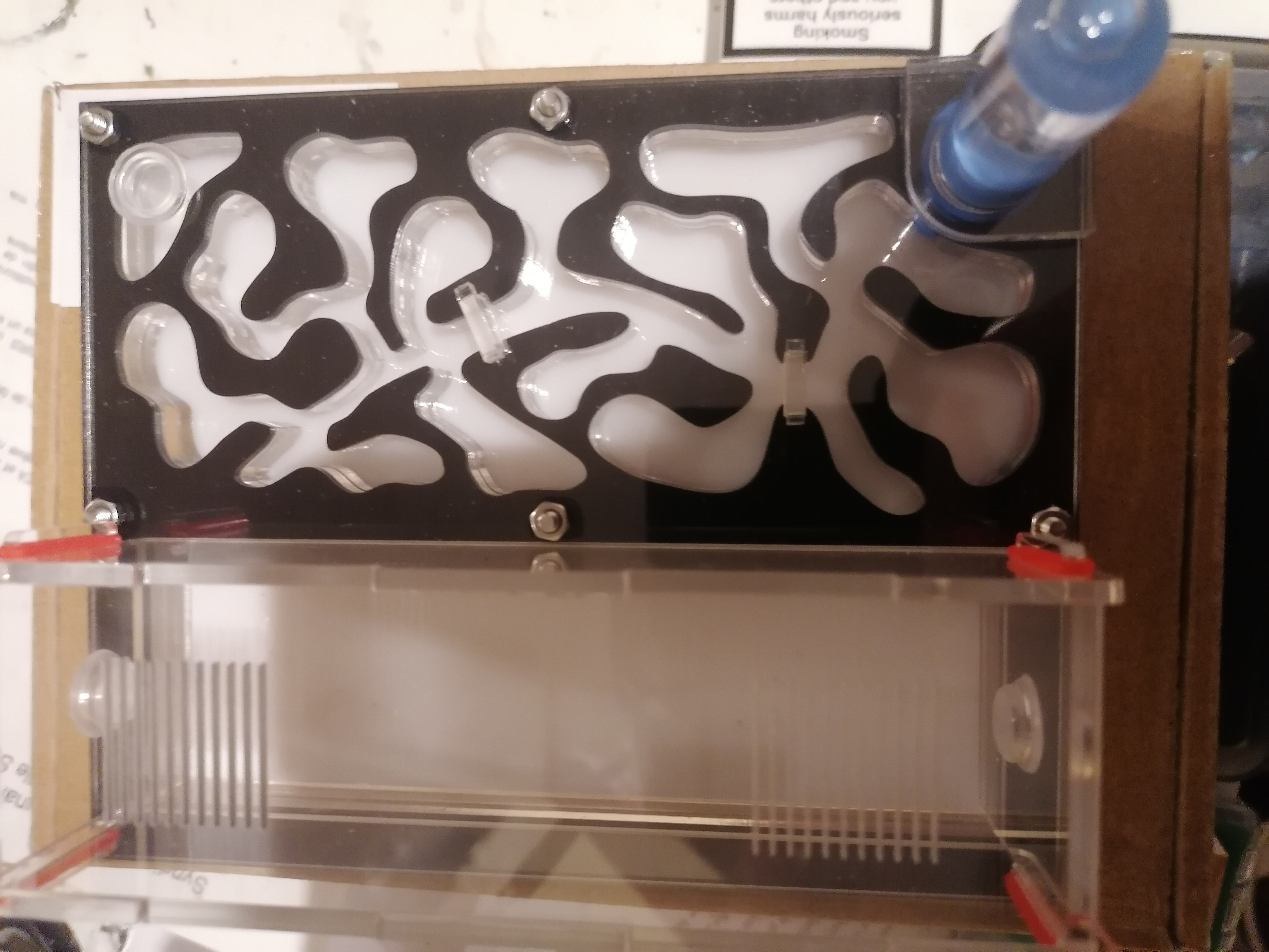 Voilà maintenant 1 semaine j'ai transféré ma gyne et ses 8 ouvrières dans un nid avec aire de chasse.
