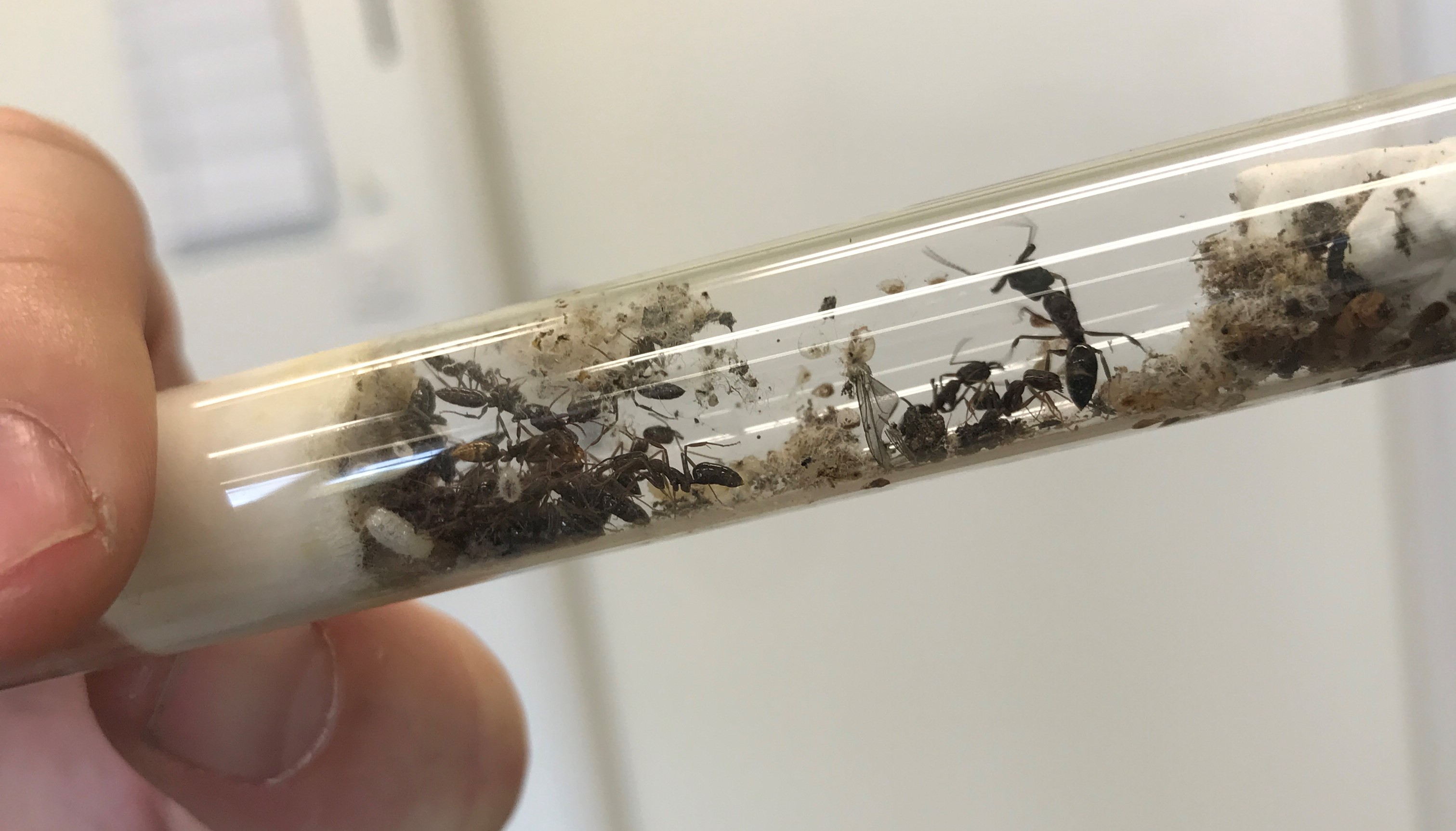Quelle qu'en soit la cause, je me suis résigné à les déménager : Le laboratoire où je travaille a, après tout, des pièces dédiées à l'élevage des fourmis... Ni une ni deux, les voici déplacées loin de moi, dans une pièce à 24°C et 60% d'humidité, loin des produits d'entretien et avec, bien sûr, un nouveau liquide sucré sans additifs.