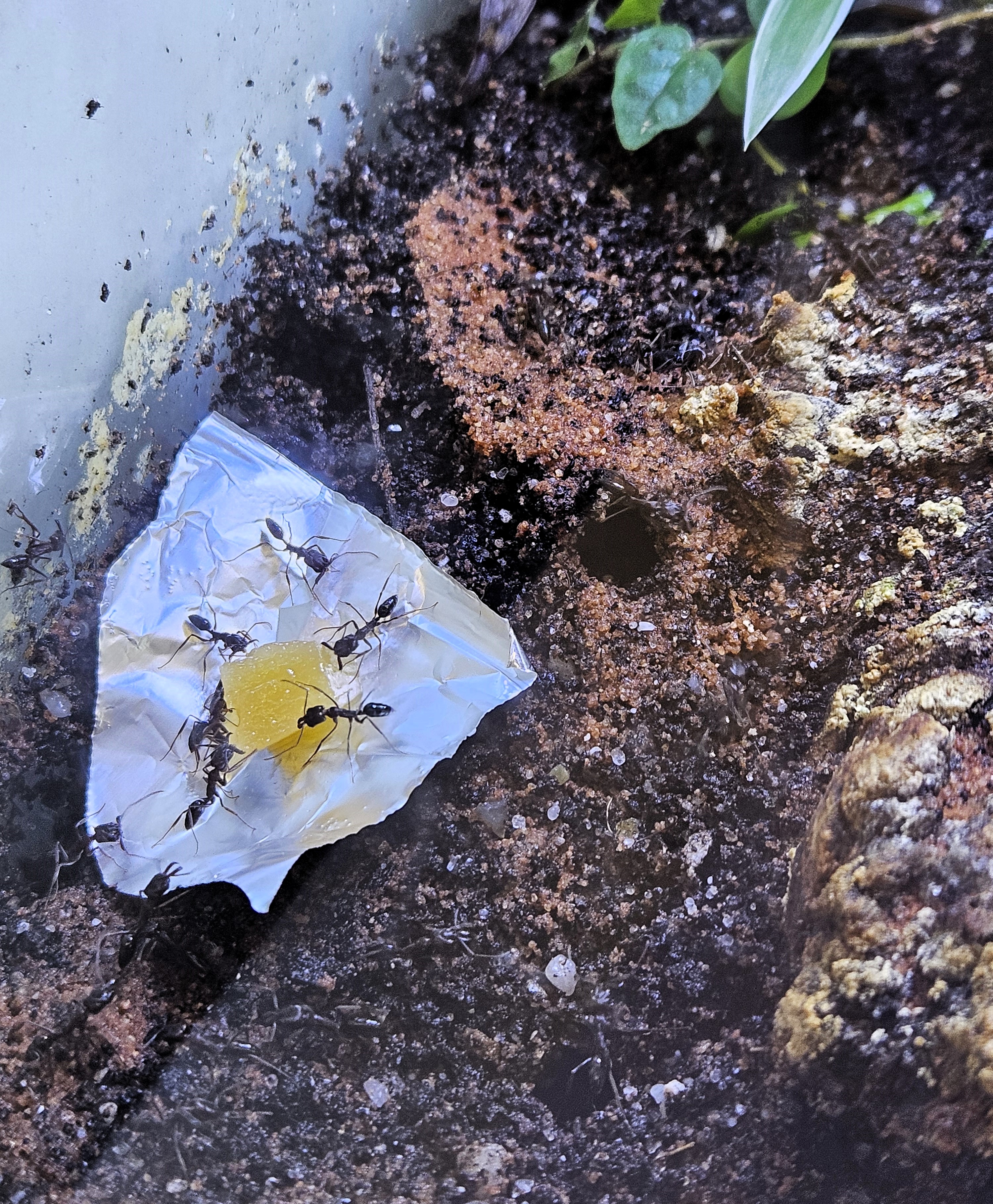 Pour celles et ceux qui se posent des questions plus techniques sur l'entretien: Je surveille l'humidité en regardant si les billes d'argile du drainage ont l'air humides. Quand c'est sec, je verse de l'eau par l'arrière jusqu'à voir un demi-cm d'eau dessous (tous les 15-20j environ). J'ai aussi récemment ajouté un petit tube à essai dans le fond au cas où les ouvrières auraient une petite soif. A part ça pas grand chose, pas besoin de toucher à l'anti-évasion (paraffine) qui n'a pas bougé, je taille quand même la chlorophytum pour éviter que ses feuilles fassent un accès vers l'extérieur.
