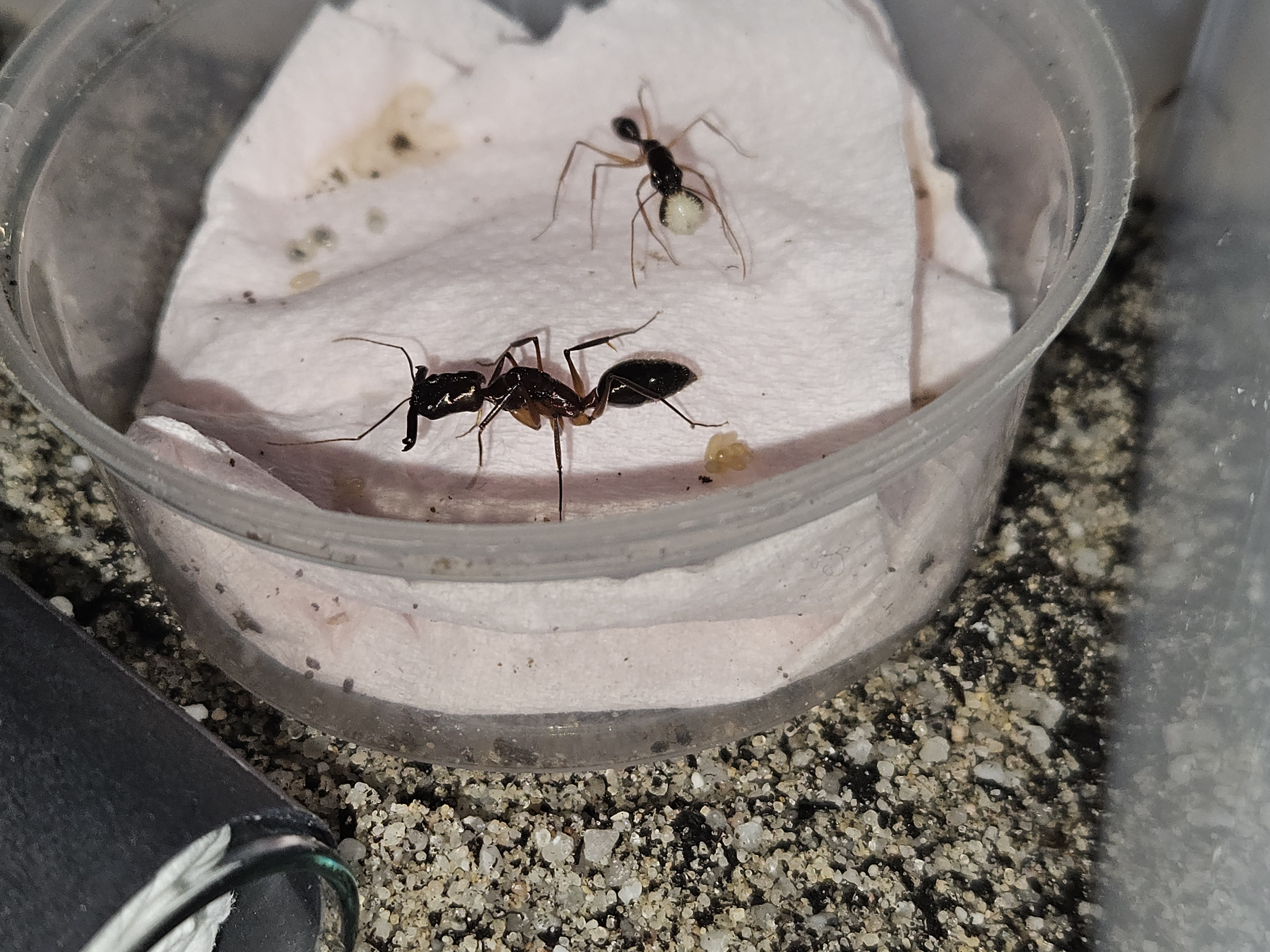 En effet depuis l'arrivée des O. rixosus, il y a eu peu d'évolution jusqu'à ce matin, avec le premier œuf pondu par l'une des reines ! Je commençais à m'inquiéter et questionner la qualité de leur setup...