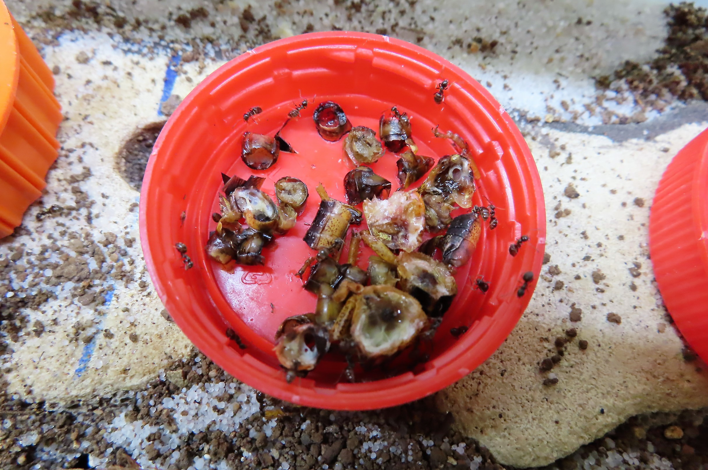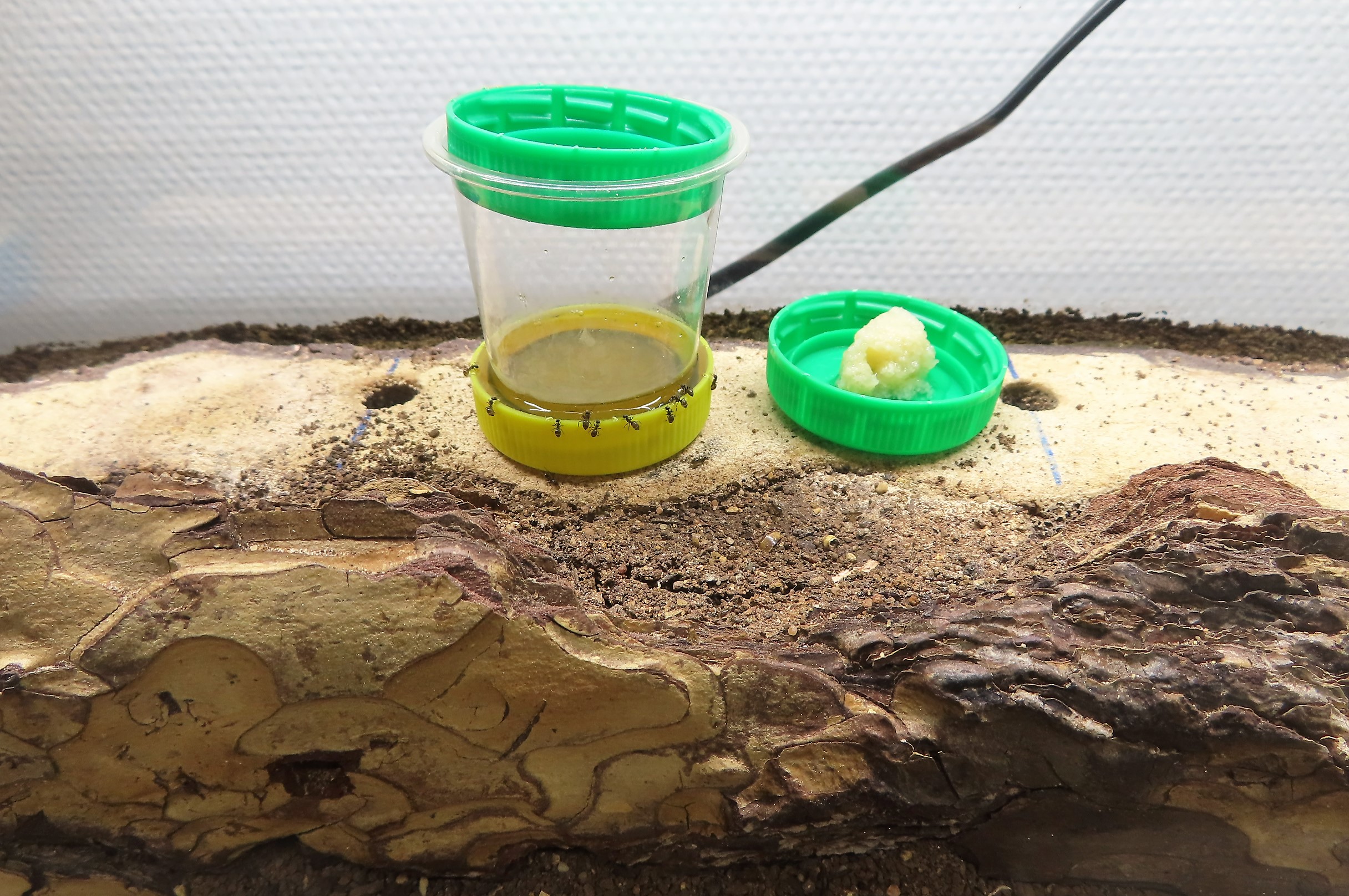 Lasius emarginatus se sont ruées vers le bouchon rouge en "phéromonant" : « Y'a un nouveau resto qui vient d'ouvrir ! Y'a un nouveau resto qui vient d'ouvrir ! ».