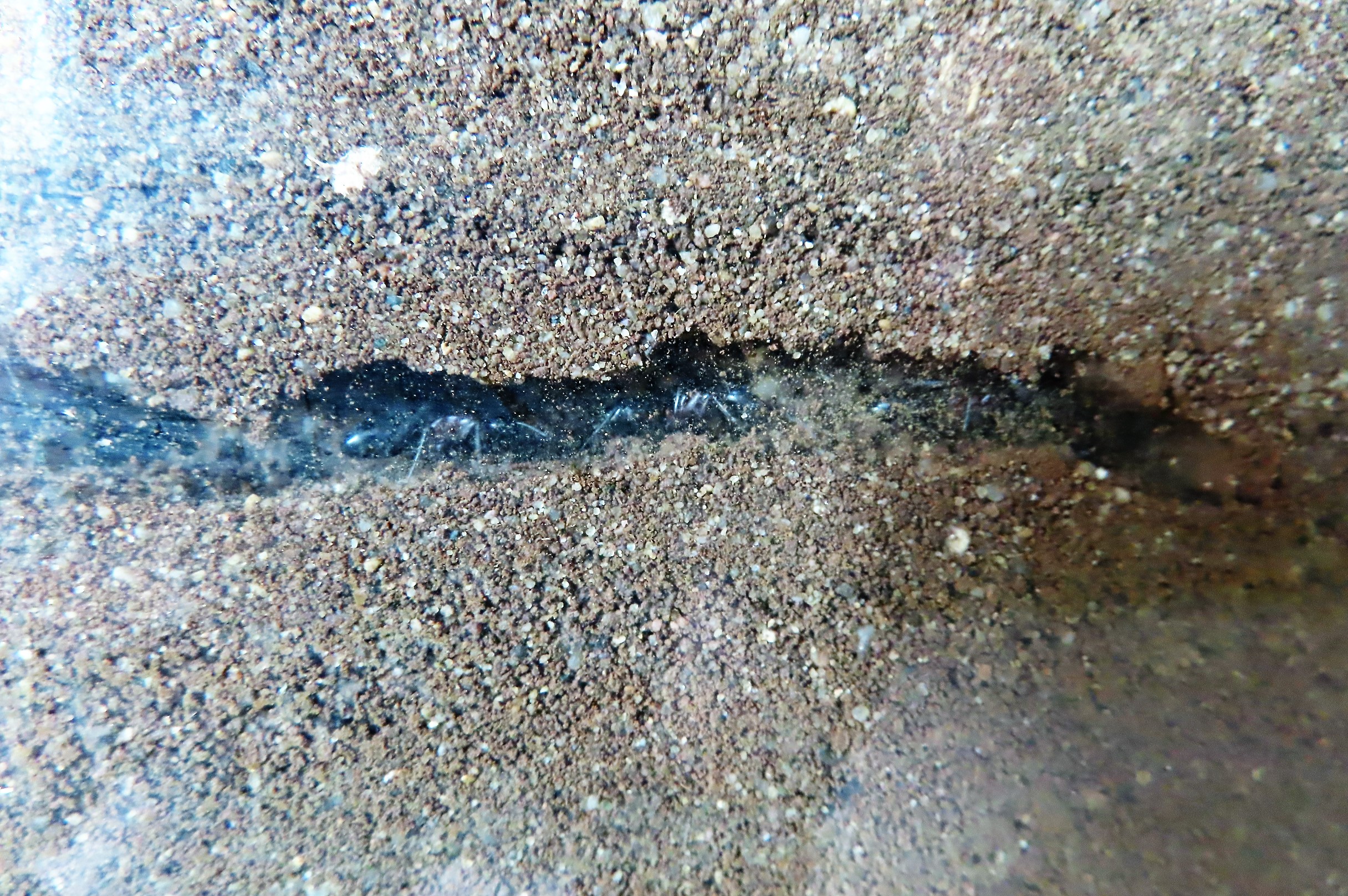 Mon excursion ayant duré pas mal de temps pour glaner tout ça puis pour revenir au bercail avec un cabas à roulettes rempli d'environ 50 Kg de débris de maçonnerie, je me suis dès mon retour attelé à la tâche sur ma terrasse pour rincer et brosser cette hétéroclite déchetterie à la pomme d'arrosage. C'est en faisant des navettes entre la salle de bain et ma terrasse que je vis ceci autour de l'entrée du nid de mes camponotes ronge-bois...