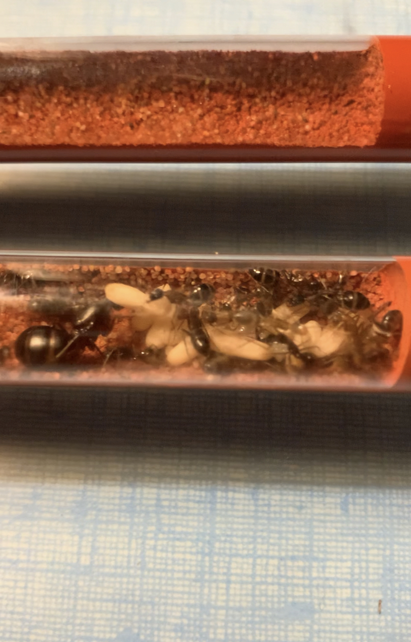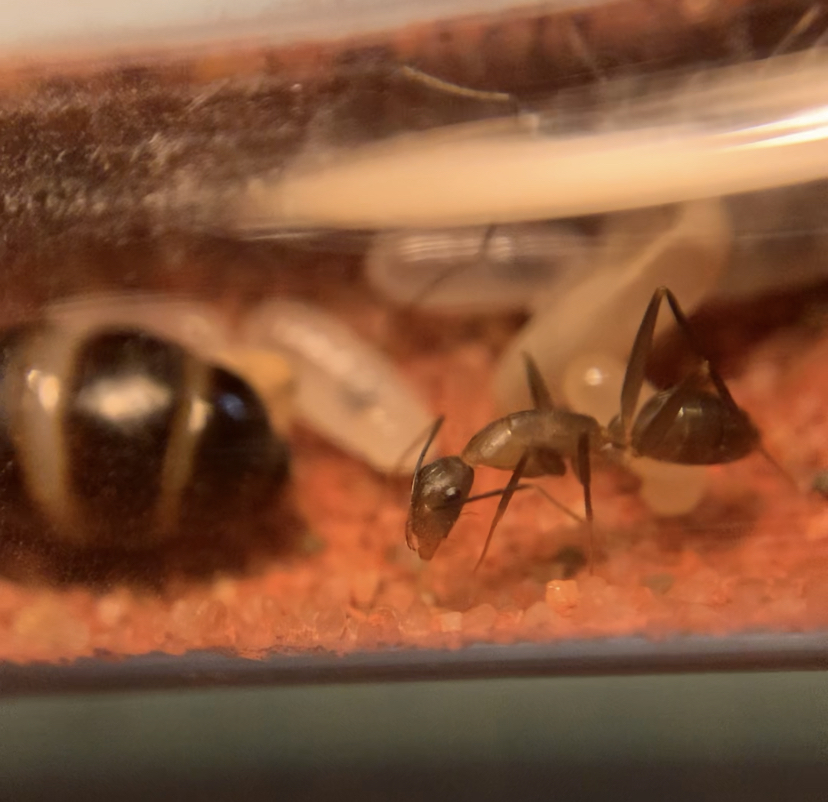 Il a du la croire à un moment morte car il paraissait inquiet de ne pas la voir bouger et avait du mal à être sure si elle nous léchait comme nous le faisions nous ... mais c'était sa première naissance de fourmi en direct alors c'est normale.