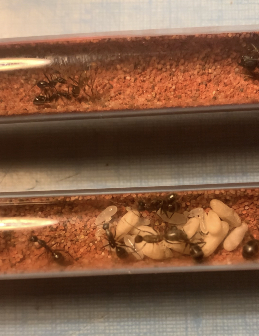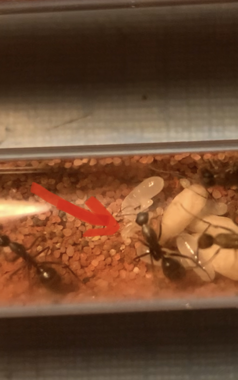 Il a du la croire à un moment morte car il paraissait inquiet de ne pas la voir bouger et avait du mal à être sure si elle nous léchait comme nous le faisions nous ... mais c'était sa première naissance de fourmi en direct alors c'est normale.