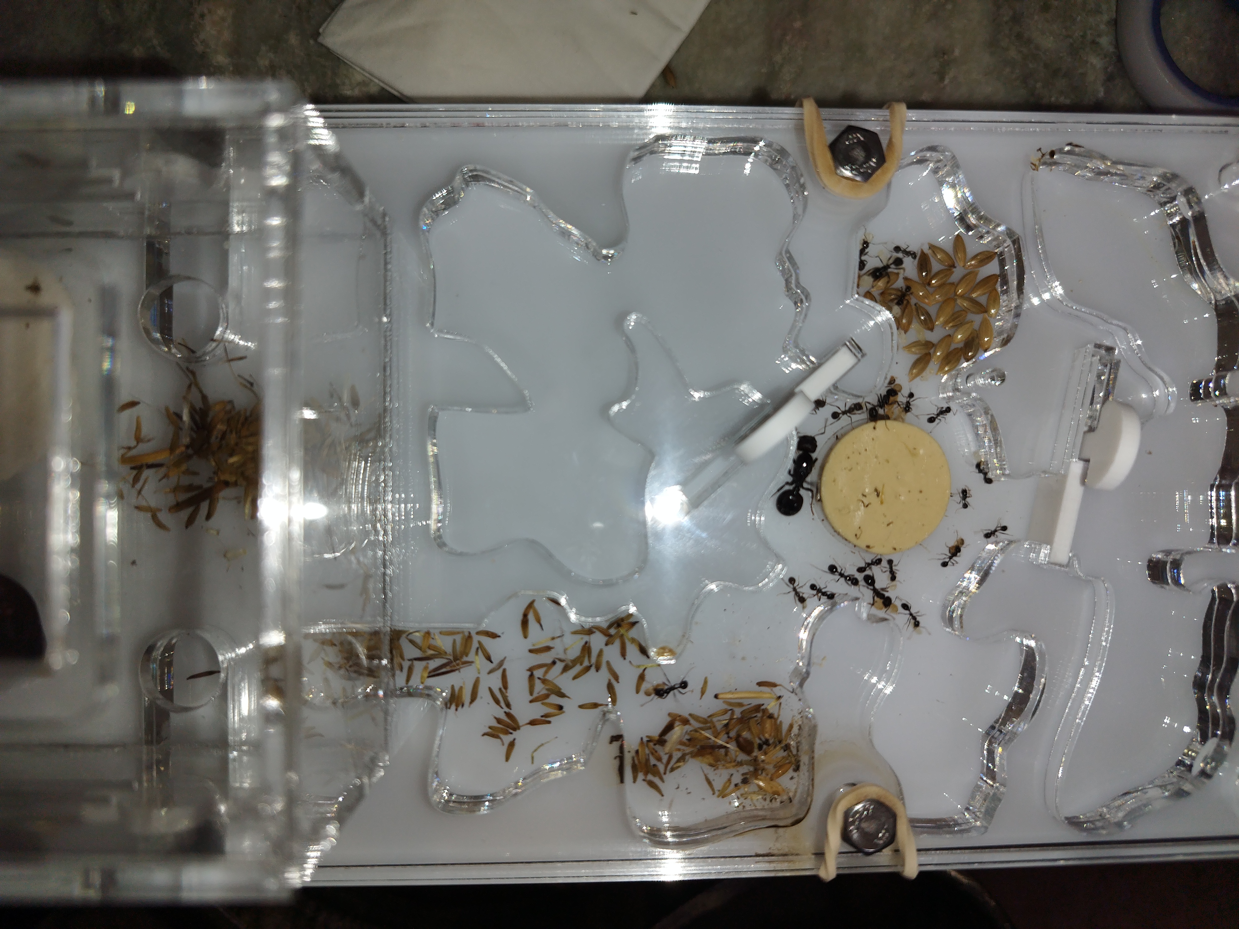 La petite troupe se développe bien, les Messor s'organisent, je tiens à vous remercier pour vos premiers conseils, j'ai mis une pièce en papier épais sous mon filtre rouge, la reine y est régulièrement.