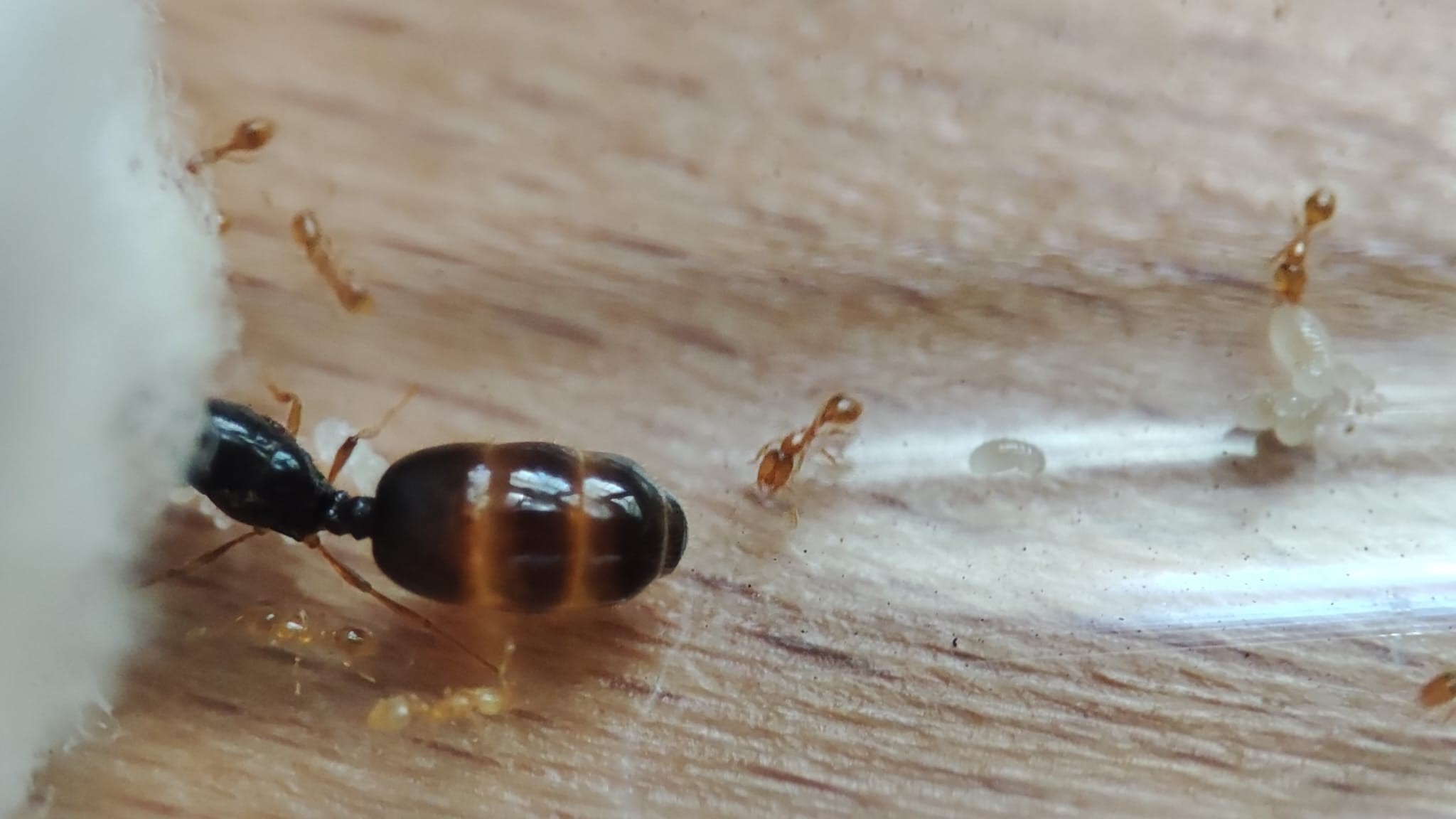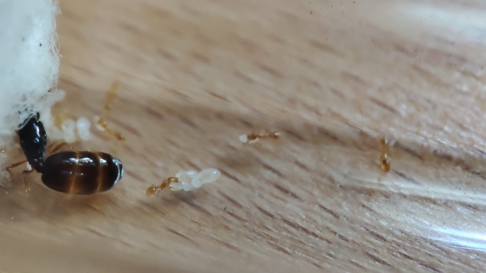 Mise en tube, je ne m'en suis plus occupée, et je pense avoir loupé les premières naissances tellement les ouvrières (jaune à brun clair) sont minuscules, je dirais 2 à 3mm!!!