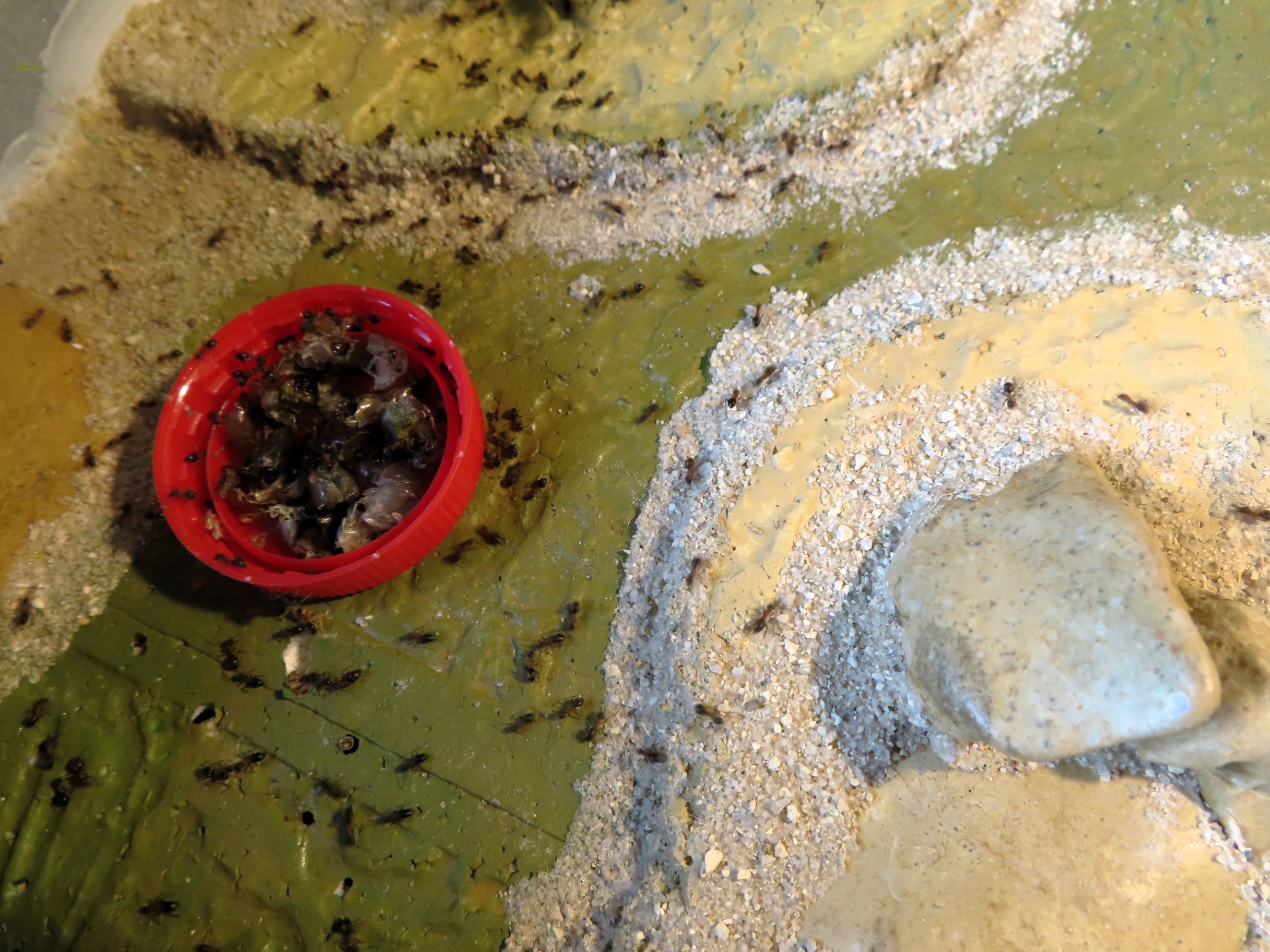 Cette semaine, mes Lasius emarginatus, ayant été les premières à remontrer le bout de leurs antennes, ont inondé leur grande ADC par leur surprenant nombre qui m'a obligé à leur distribuer quelques menus supplémentaires en complément du Bhatkar que je n'ai pas cessé de leur offrir durant la mauvaise saison où elles s'exhibaient un petit peu hors du nid sous des températures moyennement basses (10 à 15°C).