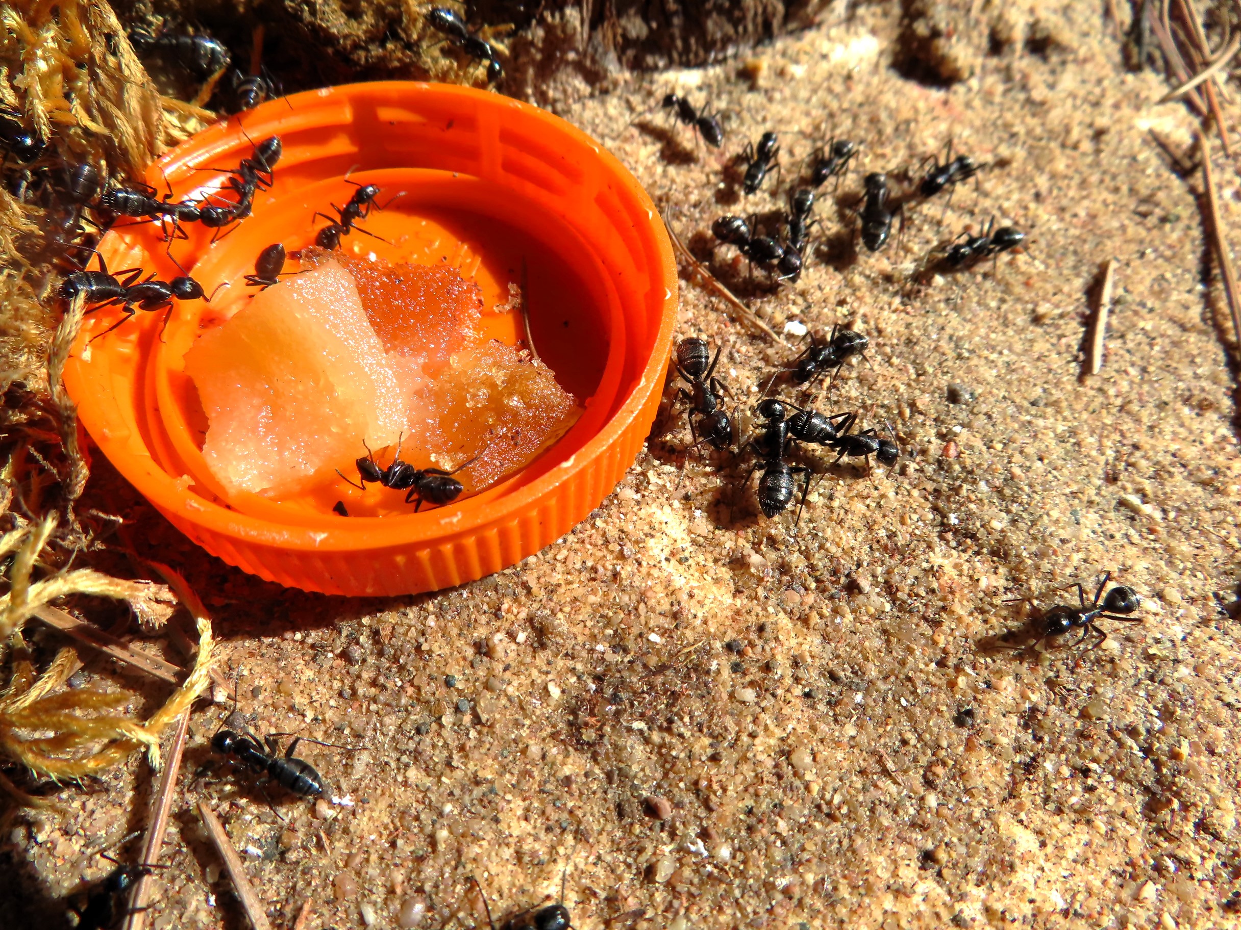 À égalité avec elles, ce sont mes adorables Temnothorax unifasciatus en semi liberté qui mirent le paquet pour aller reprendre des forces dans les bouchons nourrisseurs.