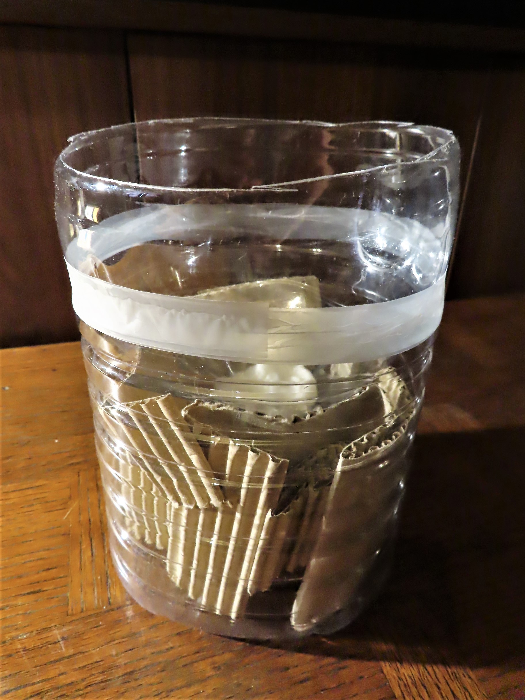 À noter sur la dernière image que le goulot d'étranglement est scotché au corps de la bouteille, puis qu'il sera bouché par de la mousse végétale ou du papier mouillé aussitôt le contenant plein de reproducteurs.