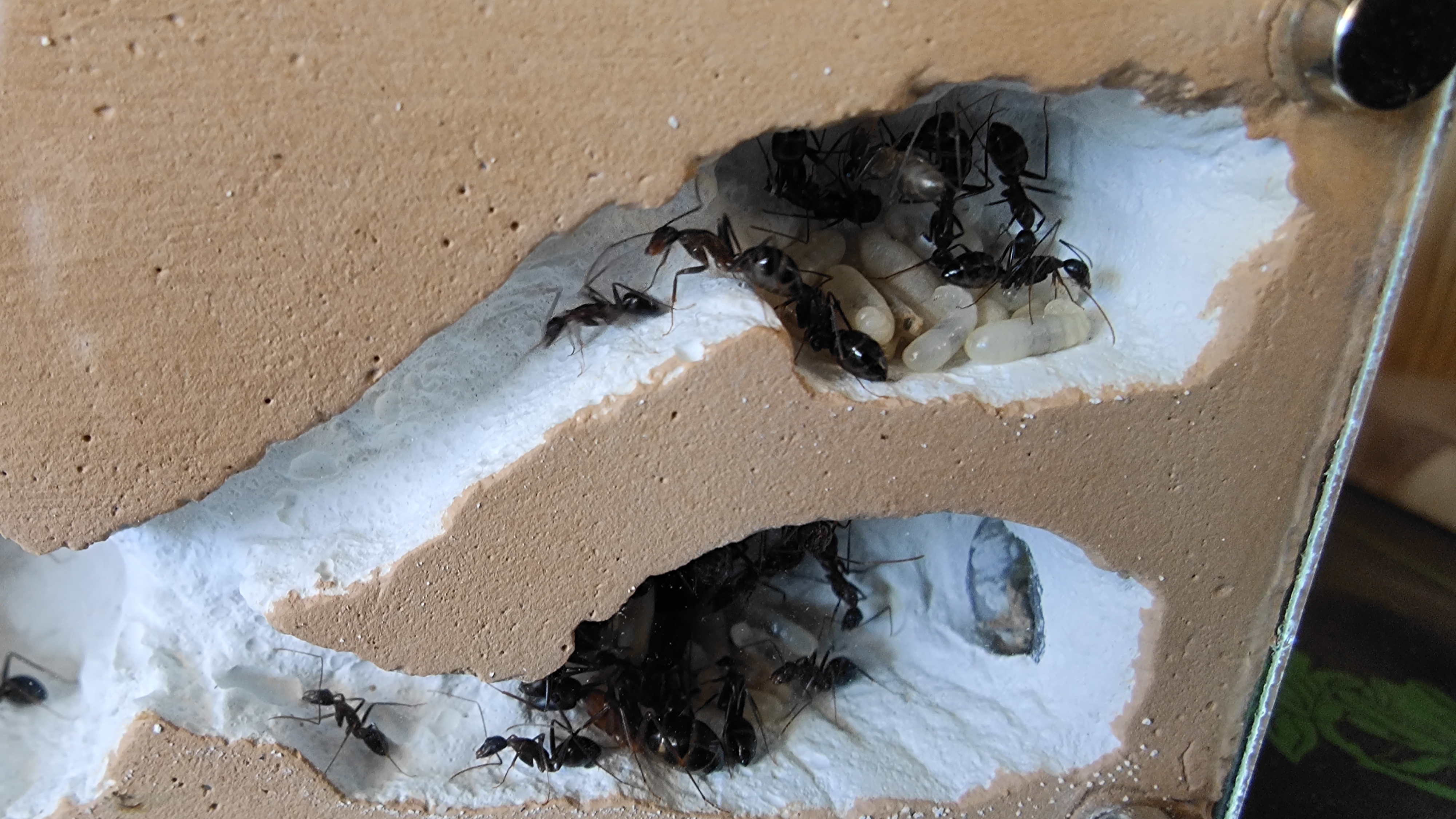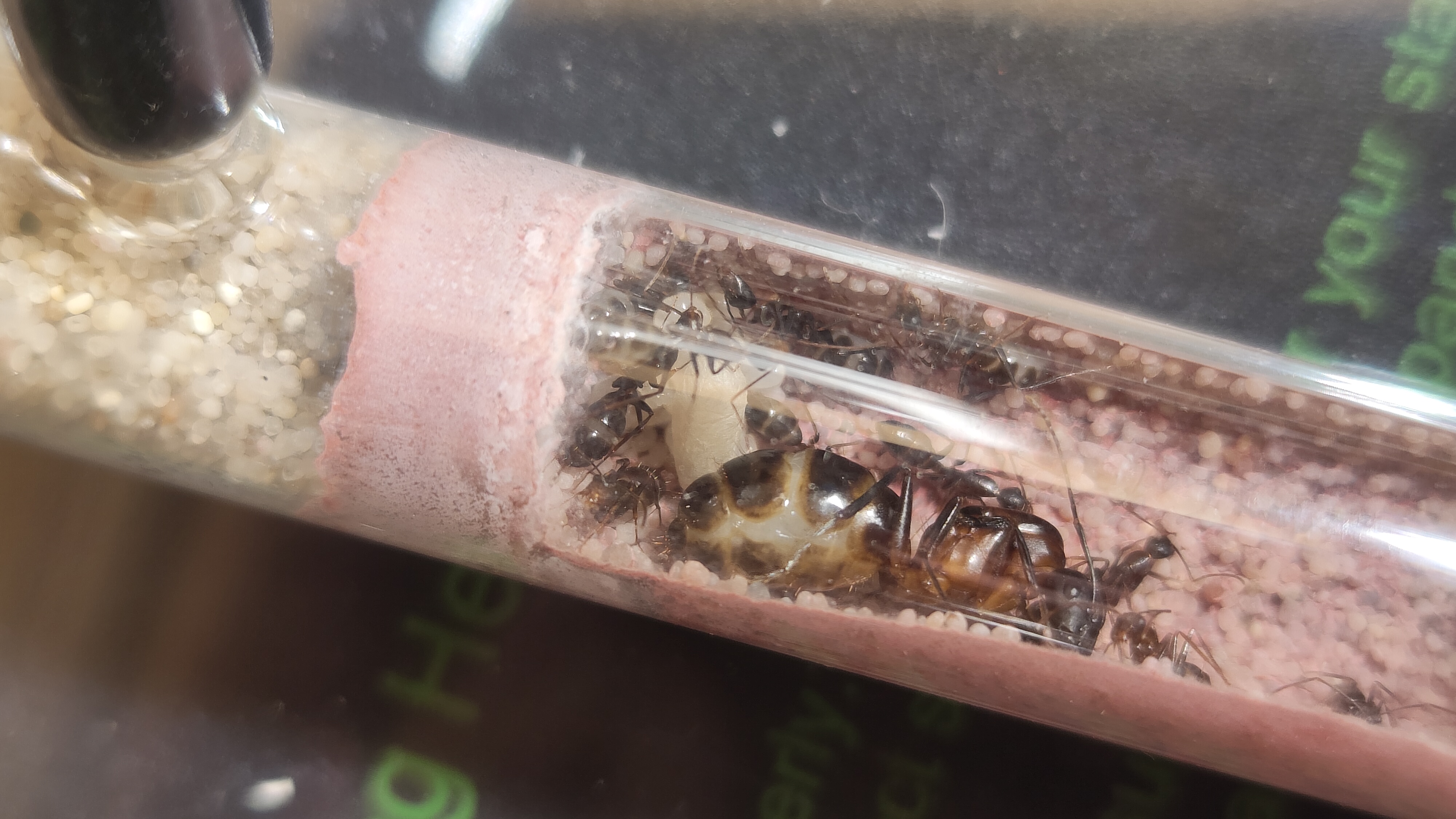 Le couvain a l'air de bien grossir, je suppose que la 1er naissance devrait arriver d'ici la fin du mois (je dis ça mais je n'y connais pas grand chose, mais 3-4 semaines max du cocon à la fourmi d'après mes lecteurs me parait bien), enfin ça c'est si la larve est bien devenue un cocon.