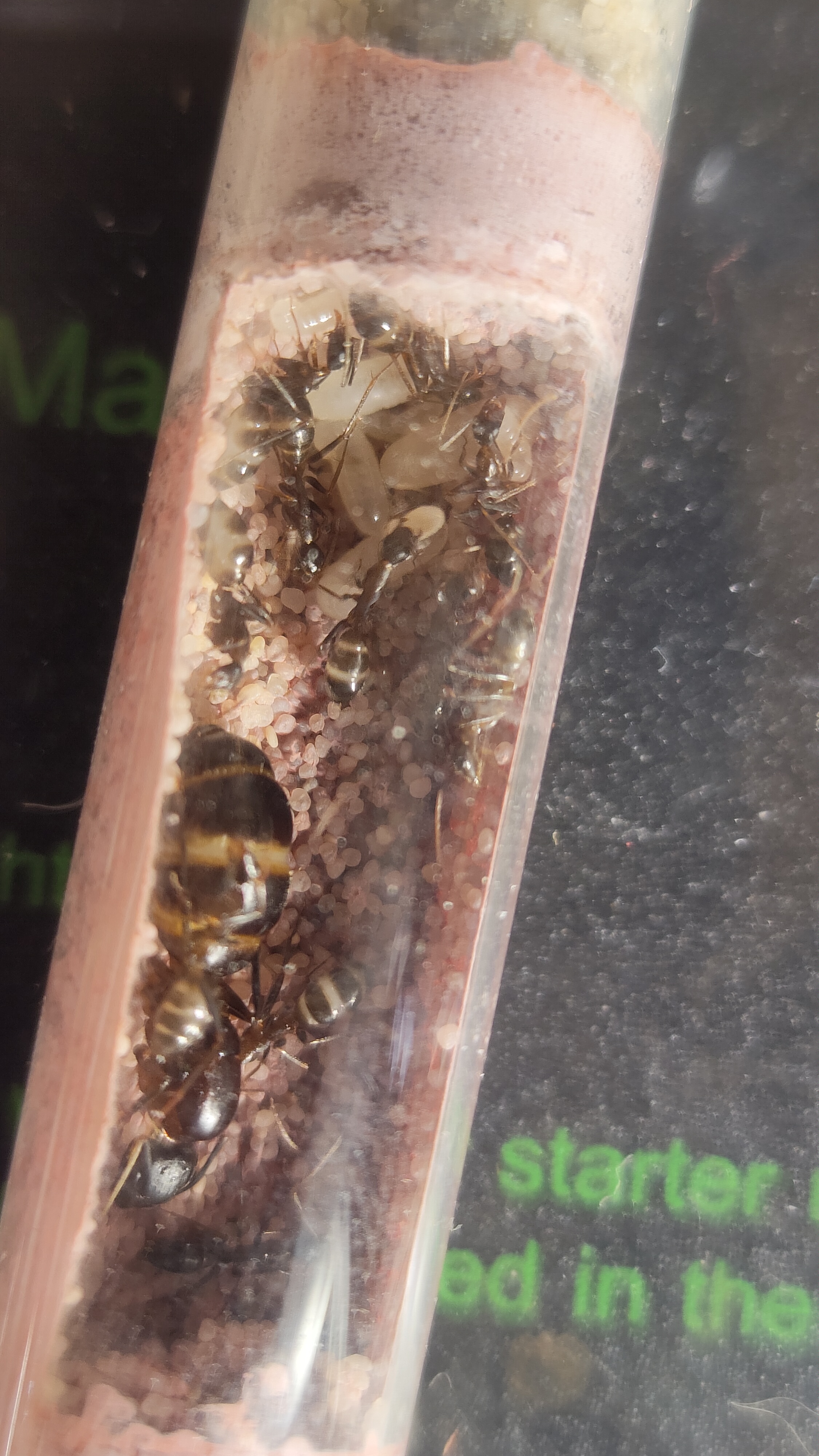 La fondation a bien proliféré, ça fait plaisir à voir. J'ai surtout eu la surprise de découvrir une fourmi immense (pour une espèce aussi grande, on voit vraiment bien la différence). Elle est presque aussi grande que la gyne.