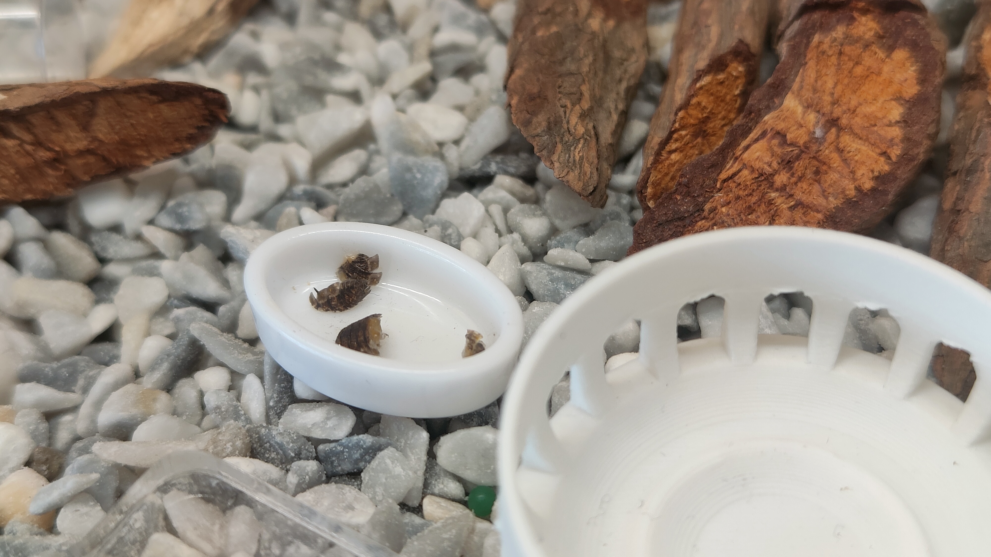 Elles mangent toujours du cloporte, enfin un morceau a disparu entre hier soir et ce matin (cloporte que j'avais déposé en 4 morceaux mercredi).