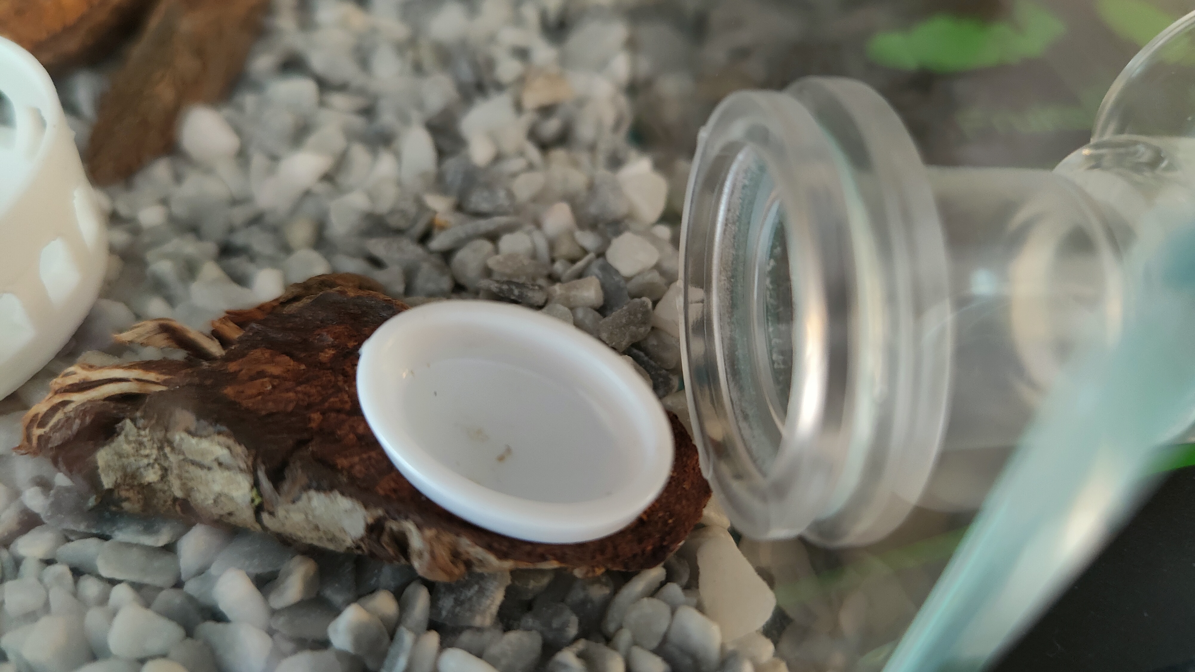 Après conseil auprès de membres du forum, j'ai rapproché la gamelle de nourriture (contenant le cloporte) au plus près du tuyau menant au nid, et voici le verdict en photo :