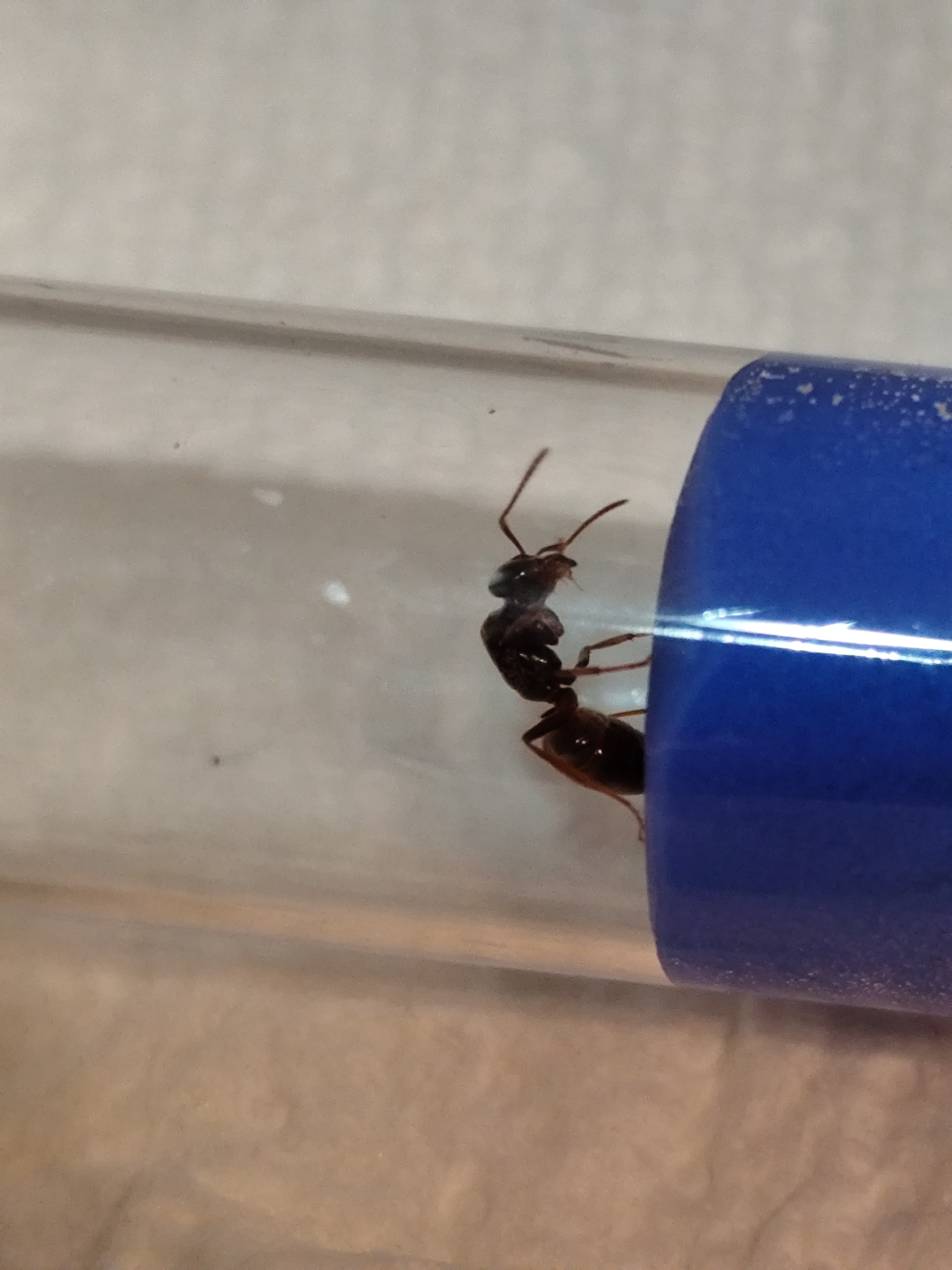 Ceci explique qu'une des 2 gynes que j'ai réussi à attraper avait une ouvrière Lasius entre ses mandibules, elle s'est frottée contre elle un petit moment, mais ne l'a pas dévorée.