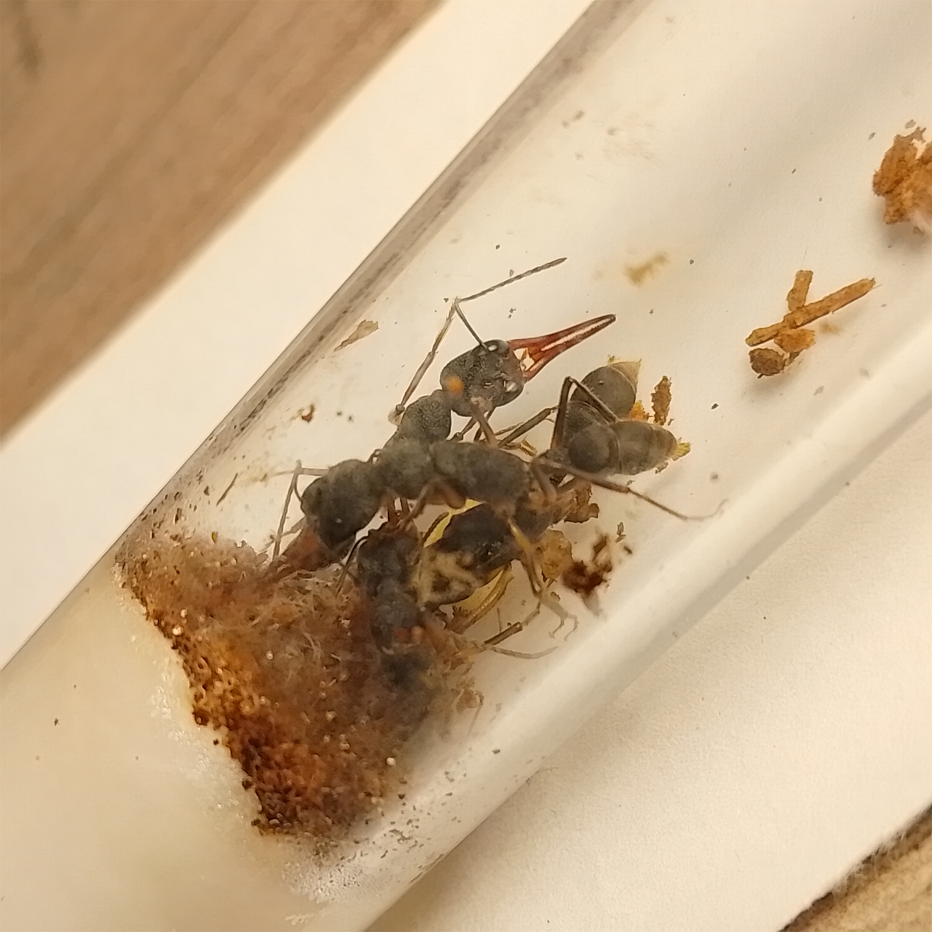La fondation est constituée d'une reine et non d'une gammergate ainsi que de trois ouvrières, une belle larves et un œuf.