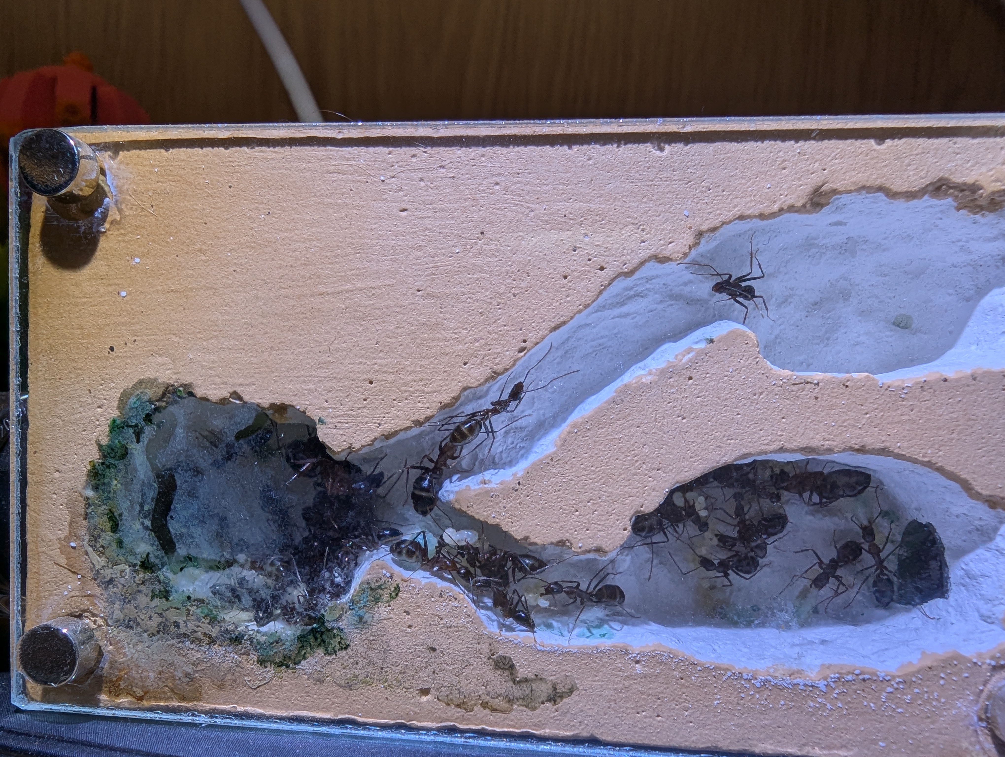 Aucune idée si c’est un bon nid ou non, car je ne l’utilise que depuis environ huit mois. Je n’aurais pas dû l’humidifier, cette espèce n’ayant pas vraiment besoin d’humidité. Résultat : une cavité avec la vitre très sale. Mais comme il y a un trou de liaison de chaque côté du nid, je pourrai l’agrandir sans difficulté — et surtout sans déménagement.