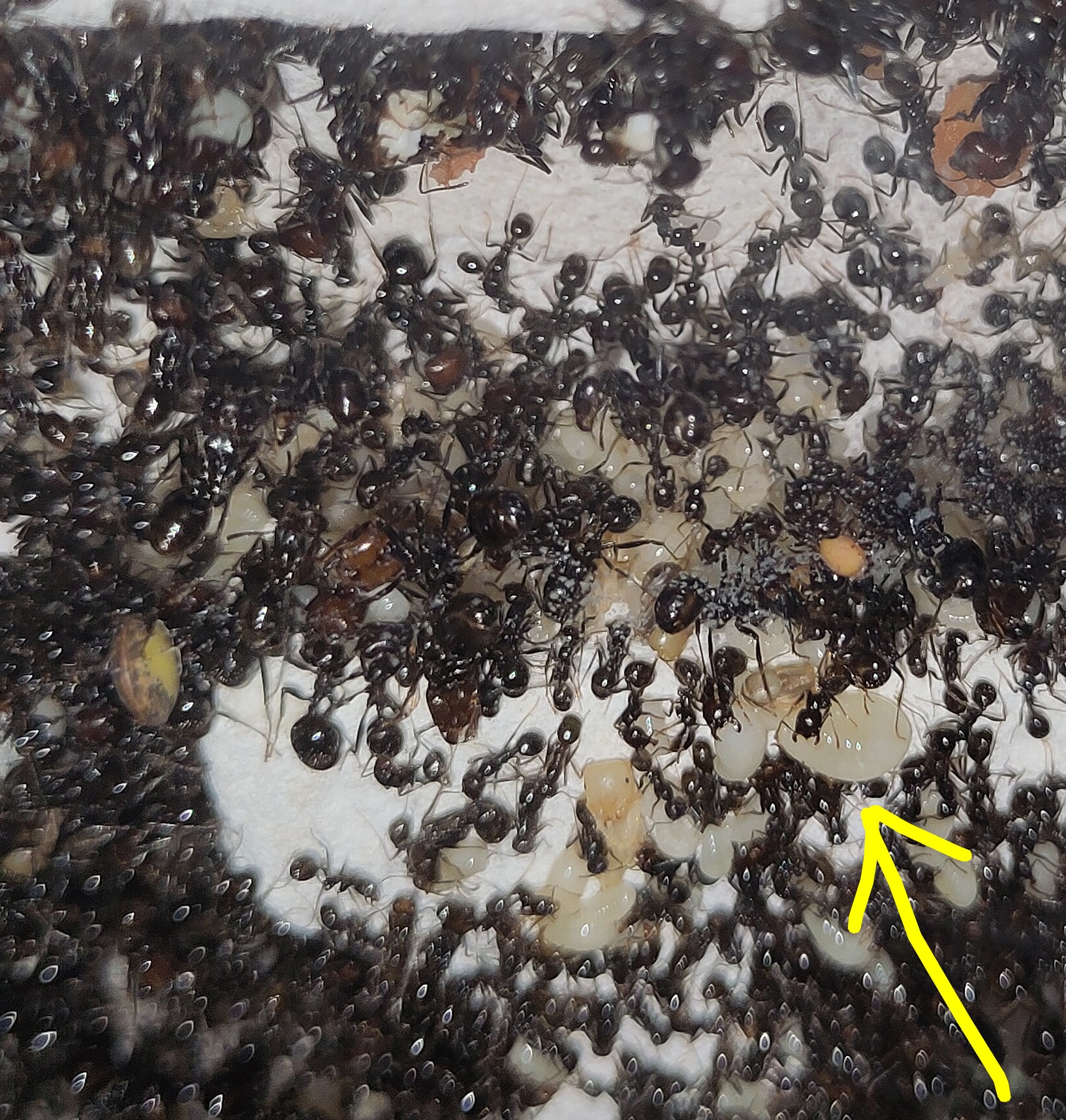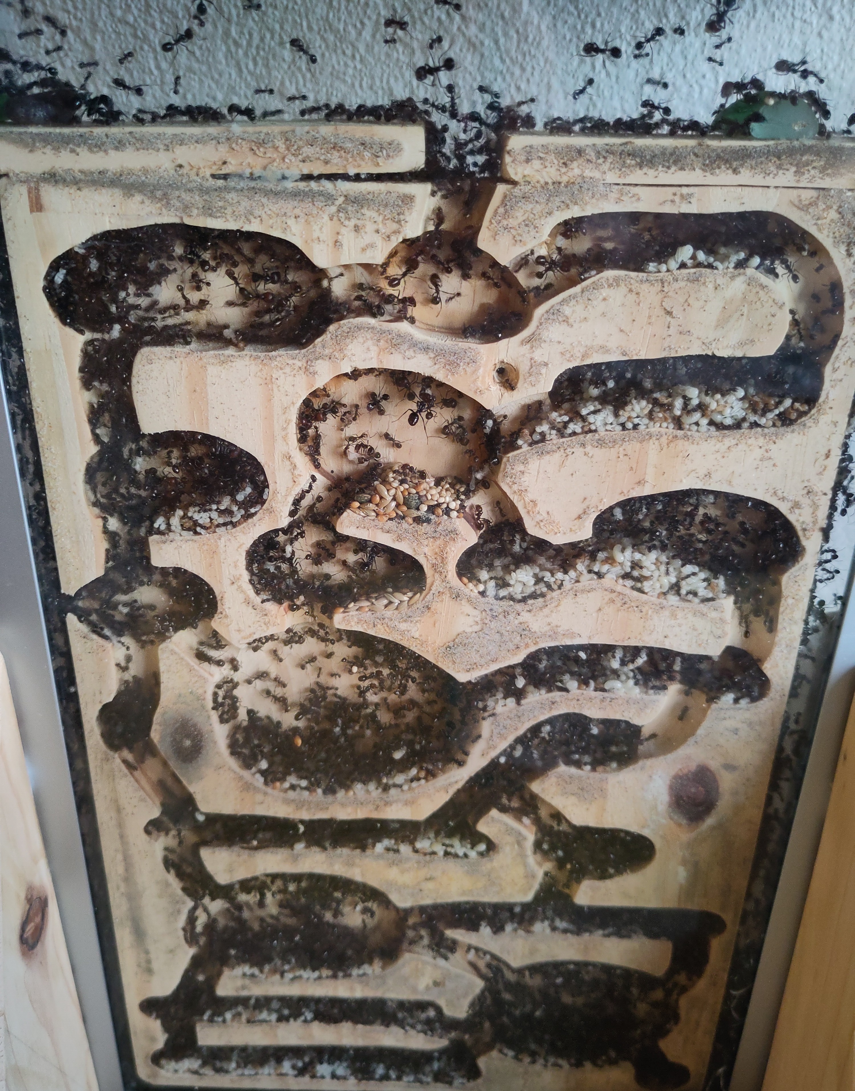 Vint donc le moment fatidique où, après avoir retiré le nid en bois de l'installation, j'ai dû le briser (la vitre était déjà cassée de toute façon...) pour y retirer les récalcitrantes. Par je ne sais quel prodige, bien qu'il m'était apparu pratiquement vide, des centaines de fourmis sont sorties du nid (probablement compactées au fond que je ne peux pas voir à cause du socle en bois). Je n'exagère pas lorsque je dis que le sol de mon appartement était noir de fourmis !