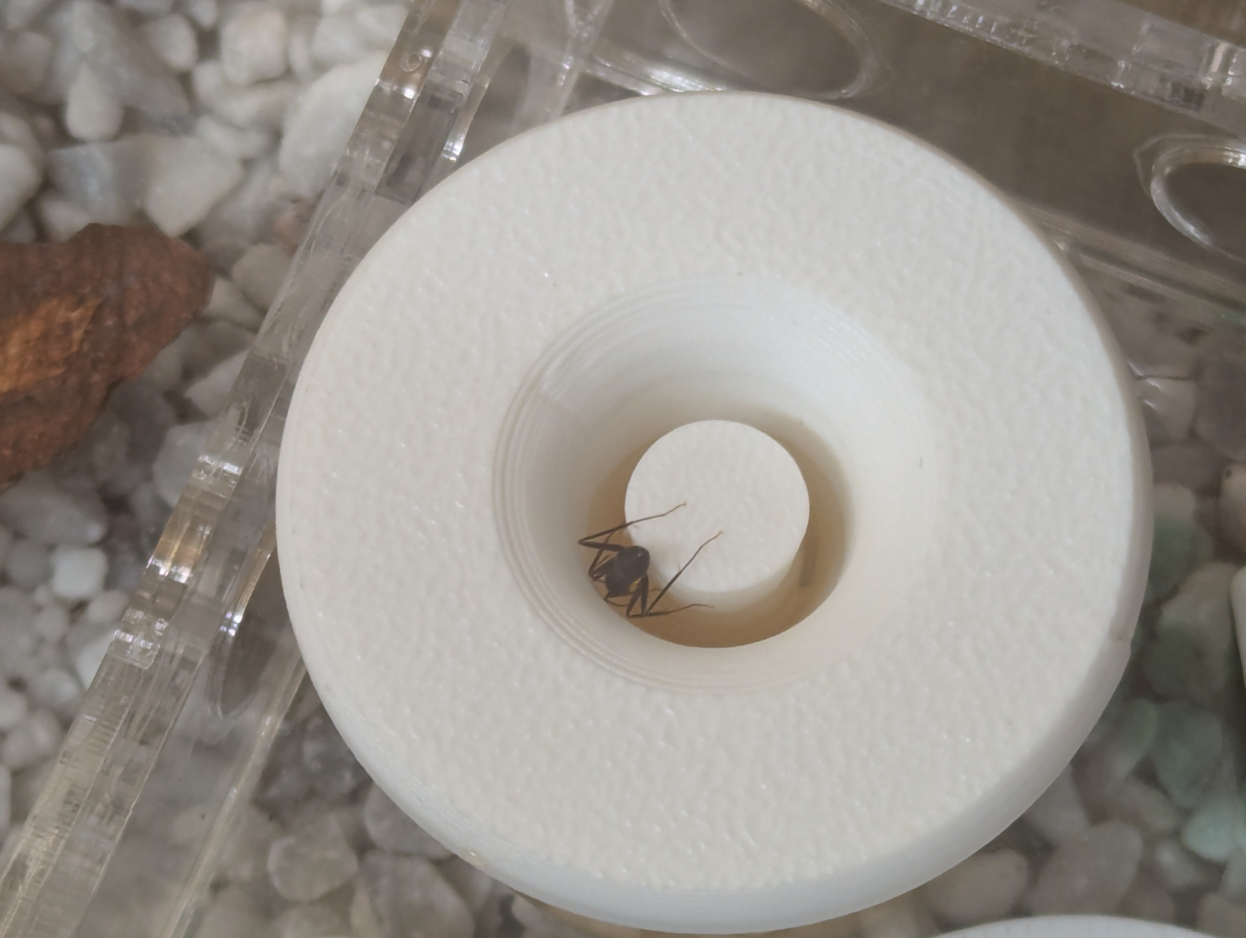 Elles mettent très souvent des cailloux par-dessus les aliments qu’elles ne veulent plus manger (ou qu’elles n’ont jamais voulu manger), comme au-dessus du jaune d’œuf (voir photo). Je n’ai pas pu le retirer, car il n’est pas accessible sans démonter les tuyaux et les déranger.