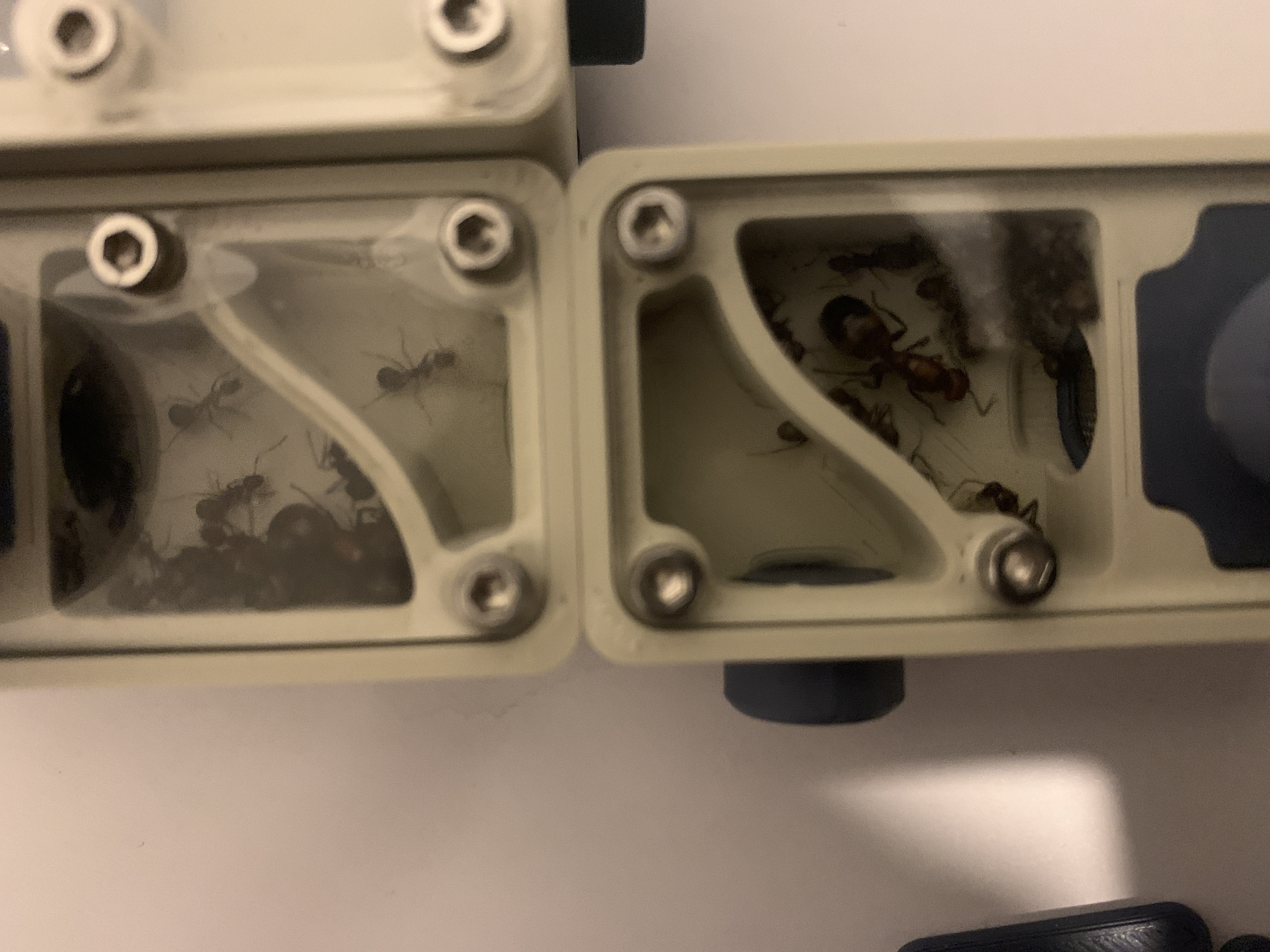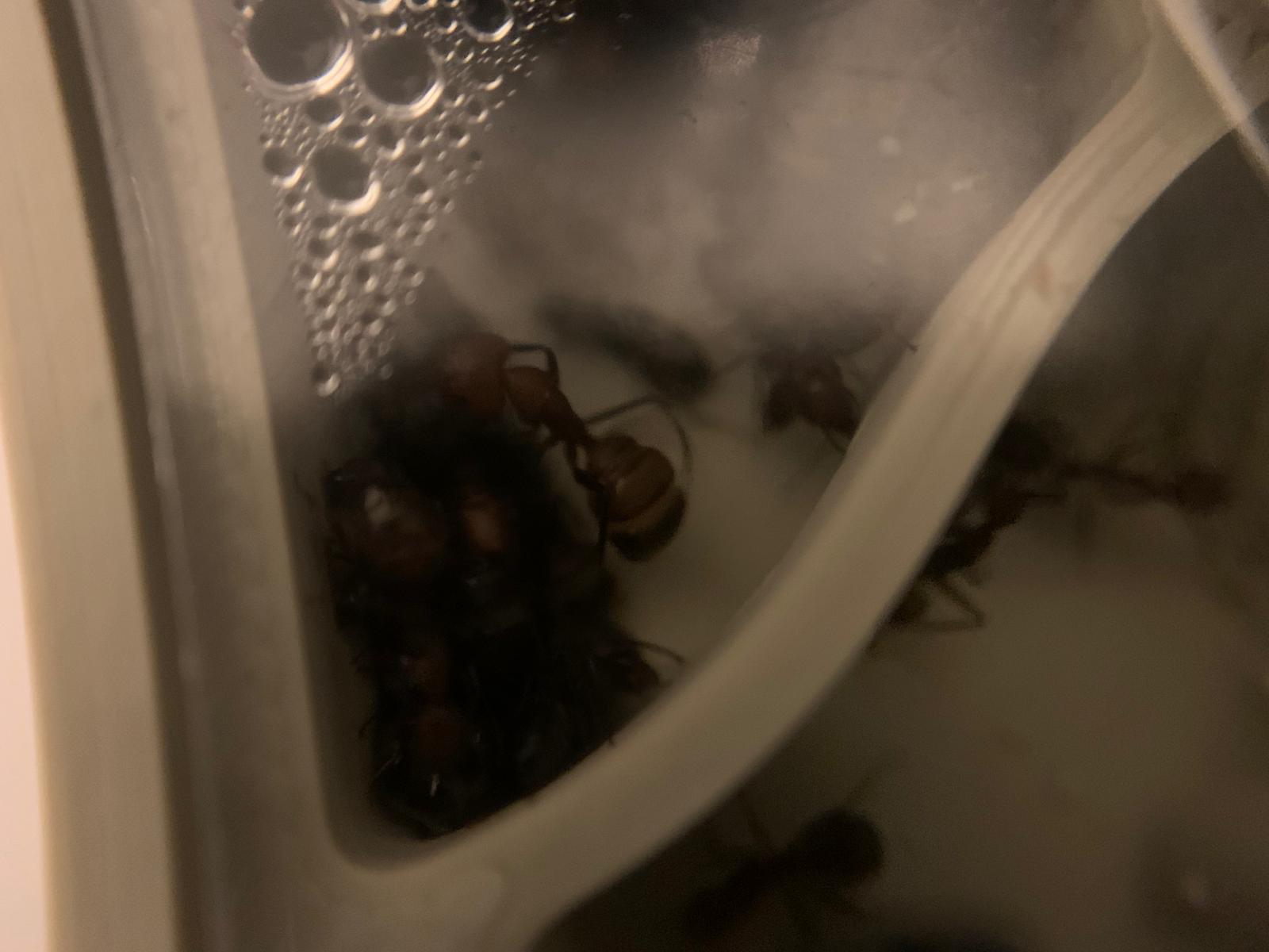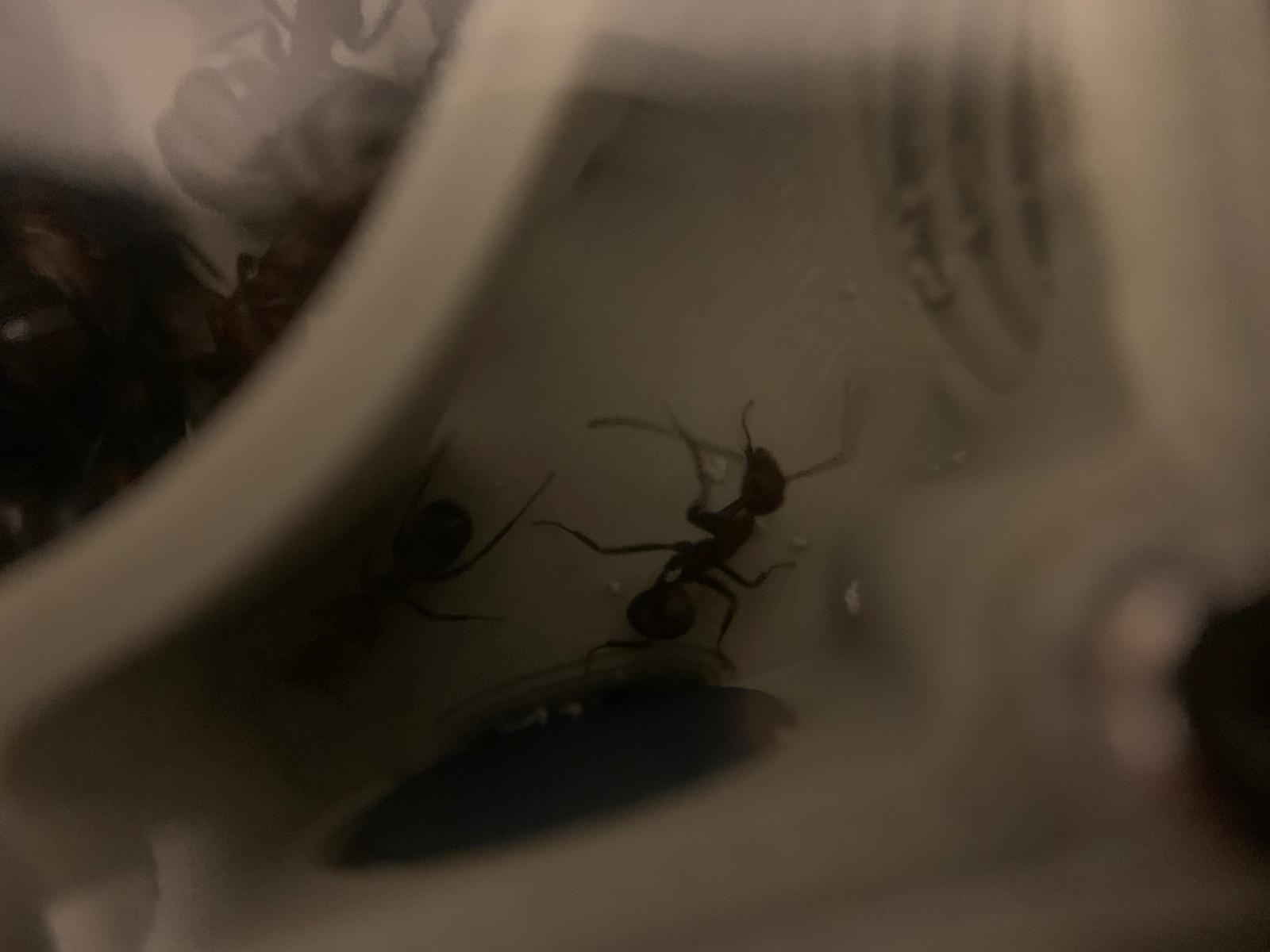 Salut, j'ai pris des photos de la fondation de Camponotus nicobarensis composée de deux gynes et d'une vingtaine d'ouvrières. Cette fondation est arrivée il y a 4 mois je pense et c'est bien développée sans aucune morte. Et elles mangent beaucoup.