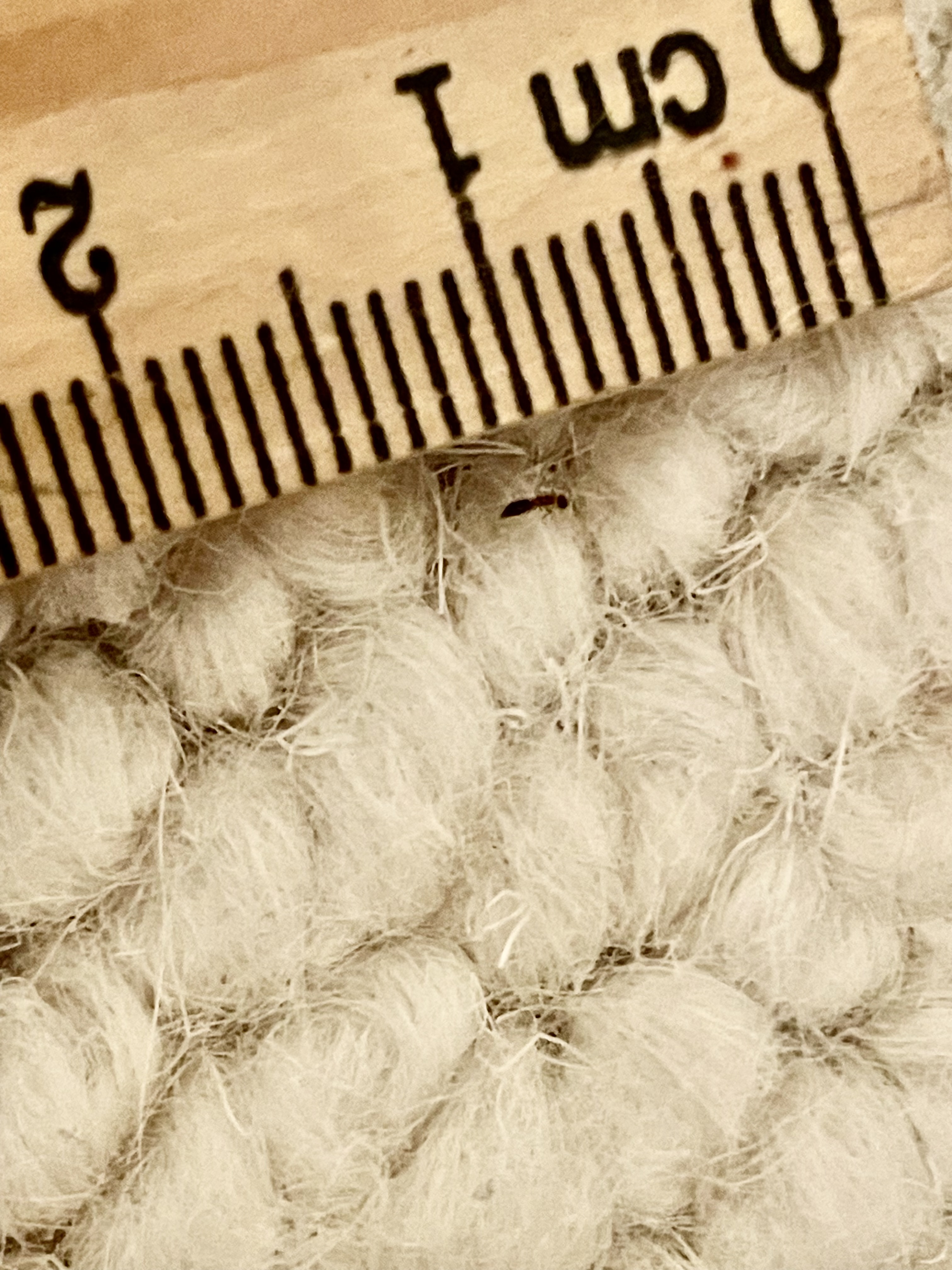 Je vous passe les détails, mais pratiquement un an plus tard, ces fourmis sont toujours là et toujours de la même façon : environ une dizaine de fourmis que je retrouve chaque jour sur mon lit ! Elles tombent des poutres qui se trouvent au-dessus une par une, au fil des heures. J’ai tout essayé, rien n’y fait, je ne comprends pas d’où elles viennent, comment les repousser, etc. Je soupçonne soit une colonie sous les tuiles, dans les plaques de polystyrène qui servent d’isolant, juste de l’autre côté des poutres (sauf que partie du toit hyper raide et je ne peux pas y monter moi-même pour vérifier), ou une colonie DANS les poutres, qui sont en effet pleines de petits trous de vrillettes. Les vrillettes sont d’ailleurs dedans, même si le traitement d’il y a 4 ans a bien réduit leur nombre, il en reste… et je soupçonne donc la mine d’or alimentaire pour les fourmis… Même si ce ne sont que deux poutres d’environ 5 m de long, donc j’imagine que les fourmis ont probablement déjà tout dévalisé en un an.