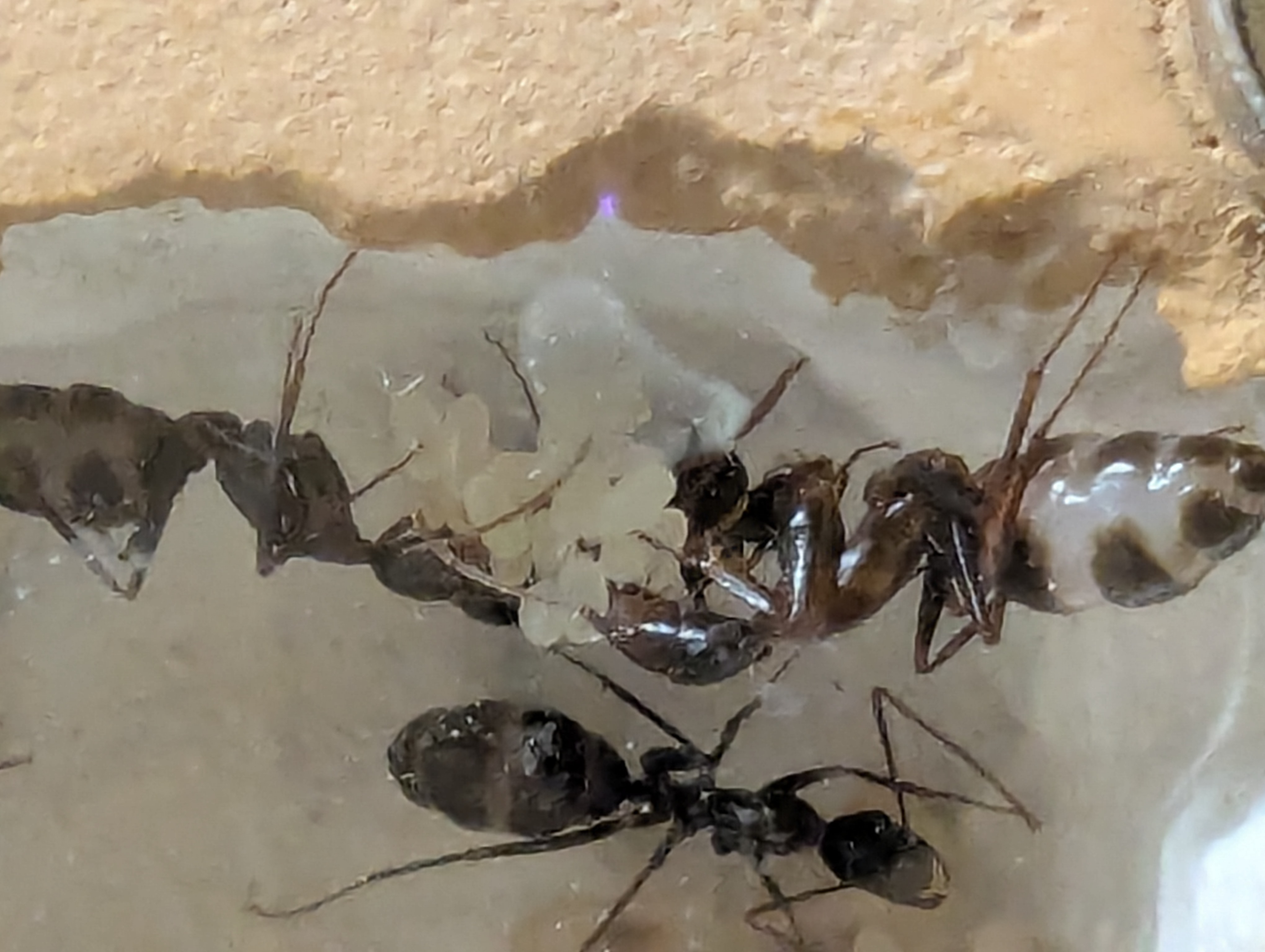 Ce que j'interprétais comme du nourrissage de larves était en réalité tout l'inverse : elles étaient en train de les dévorer. J'ai donc réintroduit deux Red Runners écrasées, que quatre ouvrières se sont empressées d'attaquer. Dans le doute, j'ai également procédé à une légère humidification du nid.