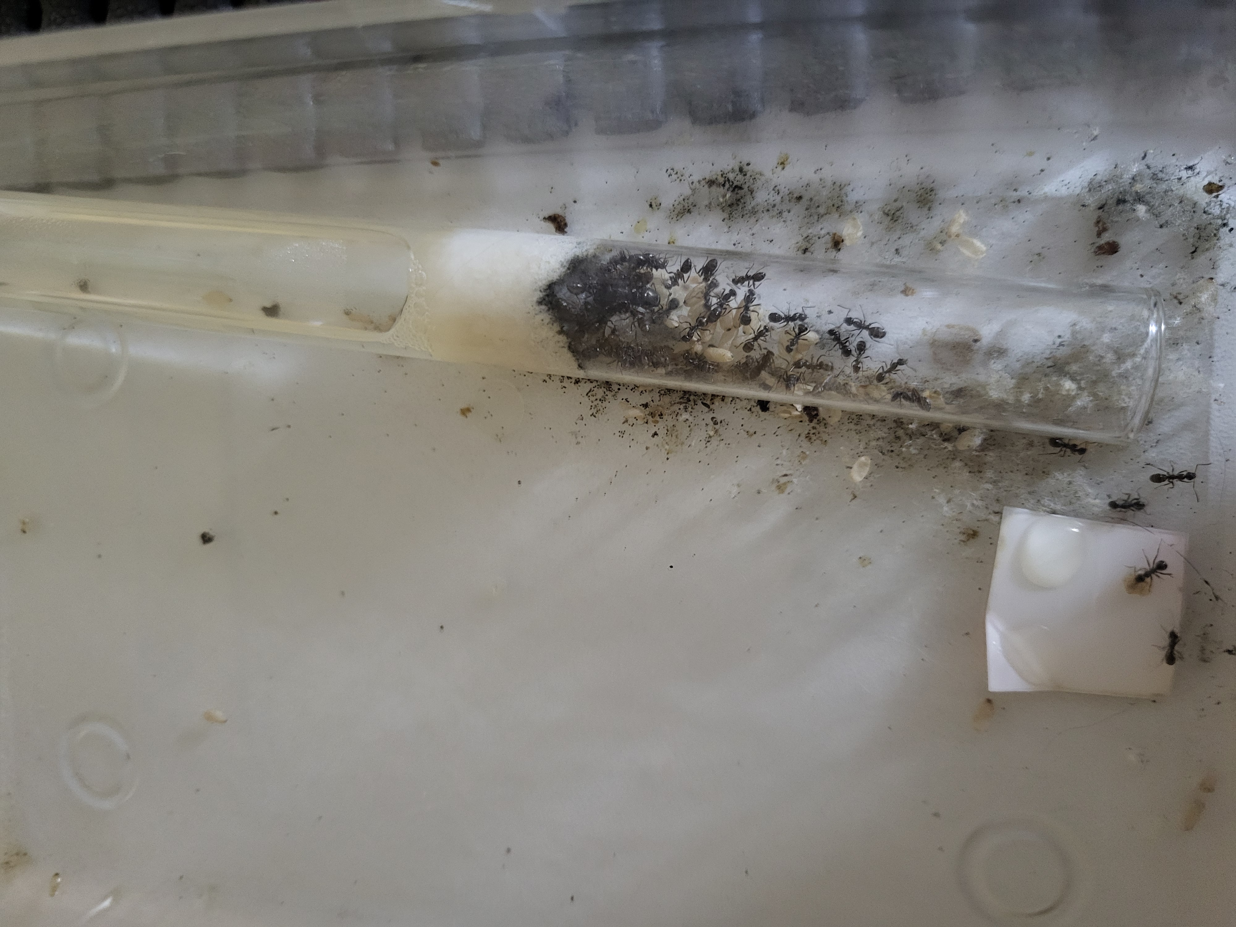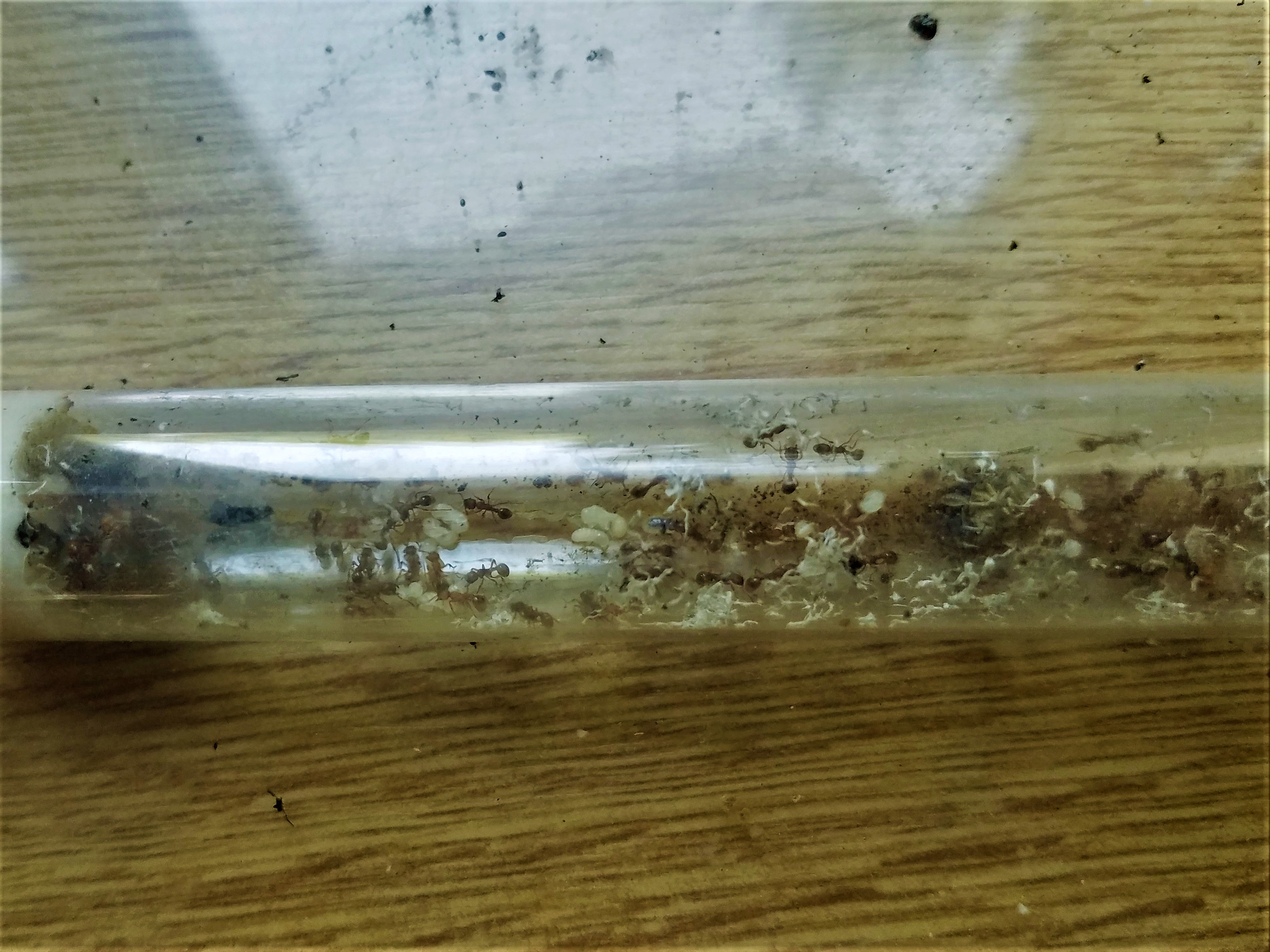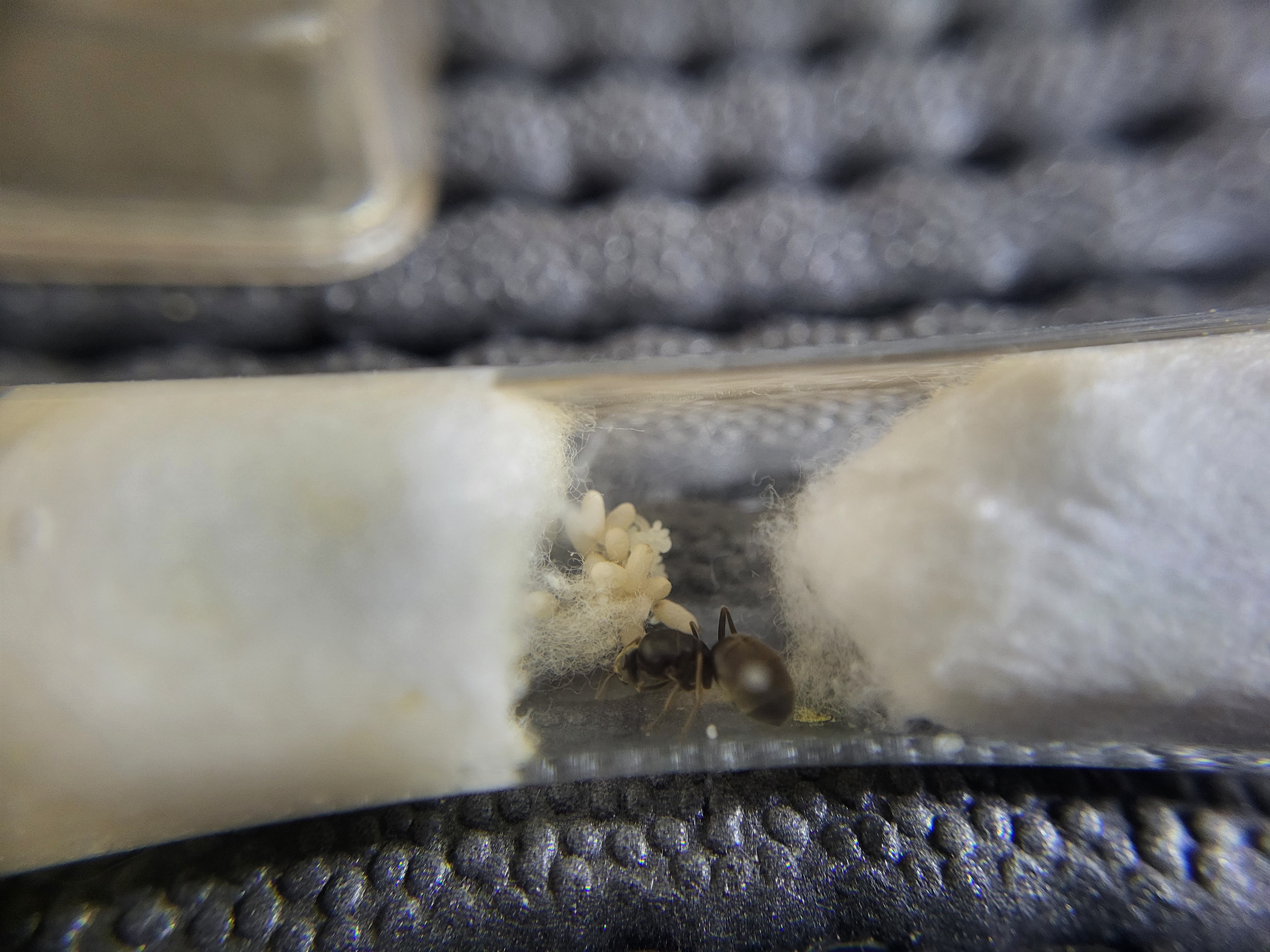 Pour cette fondation (qui n'a pas sa place côté bonnes nouvelles mais elle ne l'a pas non plus du côté mauvaises nouvelles), après un léger boost de 3 cocons de mes Formica fusca (que j'avais ouvert ensuite pour les aider à naître car la reine ne s'en occupait pas...), la gyne s'est remise à pondre et j'ai un fébrile imago qui se met à bouger un peu.