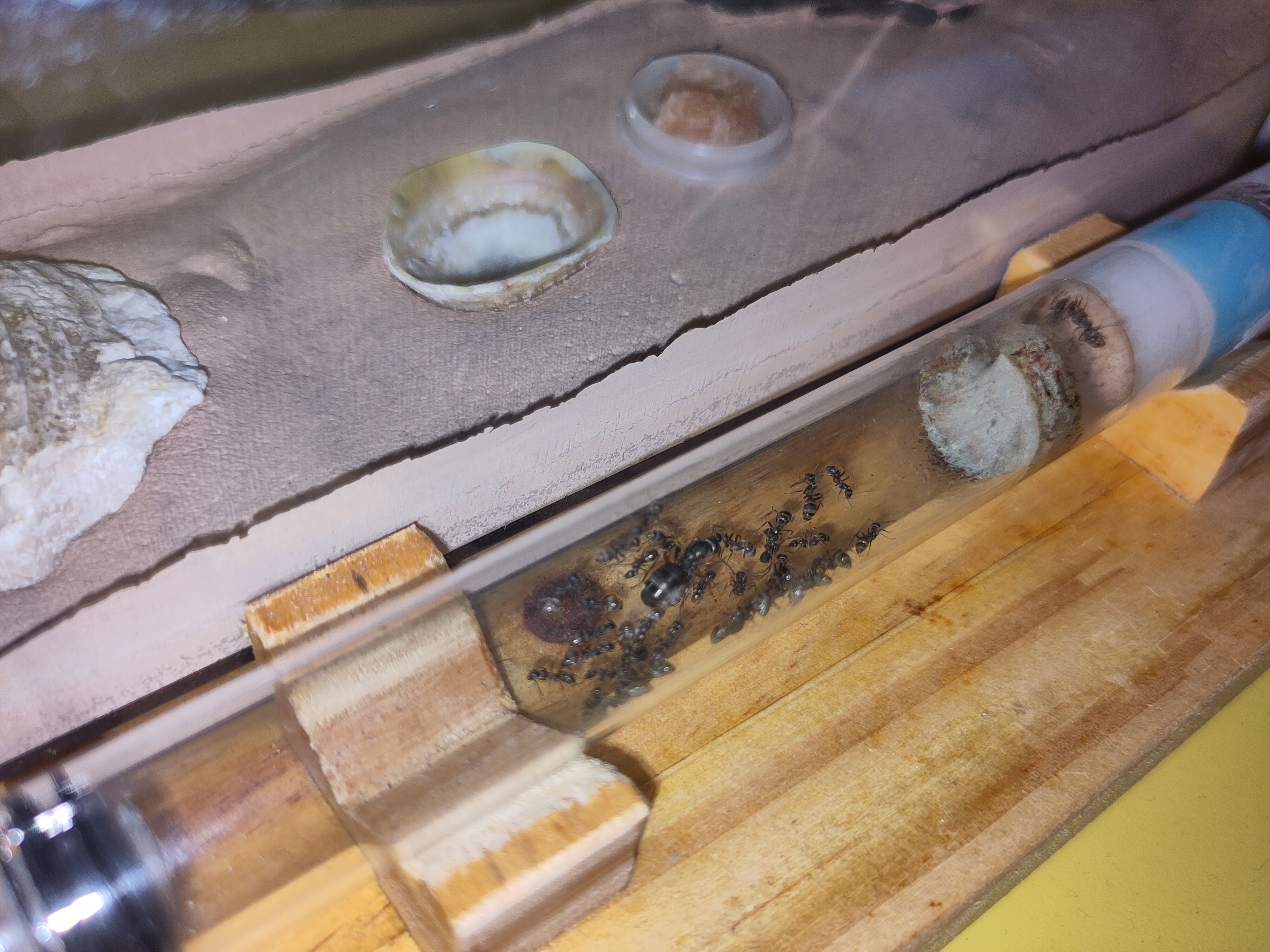 C'est une nouvelle aventure qui commence ici avec une fondation de Formica sp., probablement Formica cunicularia, généreusement envoyée par Mic (en tube rechargeable) et réceptionnée mercredi dernier ! Dans ce colis, il y avait également une jolie petite ADC incluant un support pour tube, une mangeoire, et de l'anti-évasion déjà appliqué (fluon), le tout très bien emballé !