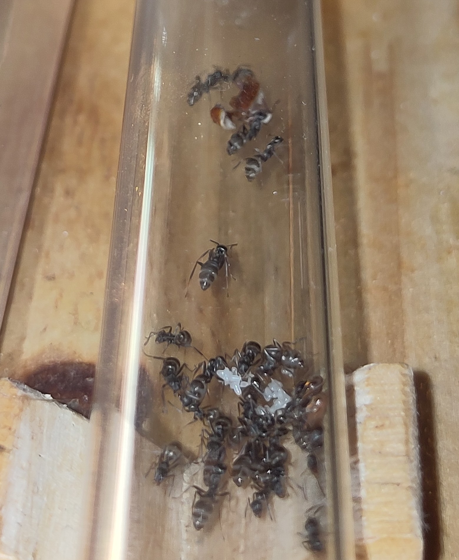 Cette fondation est assez exceptionnelle, et je n'utilise pas ce mot de façon anodine : j'y ai compté pas moins de 27 ouvrières et 9 nymphes/cocons ! Et pour cause, la gyne a effectué 2 pontes en cette première année, ce qui d'habitude n'arrive jamais chez les Formica spp..