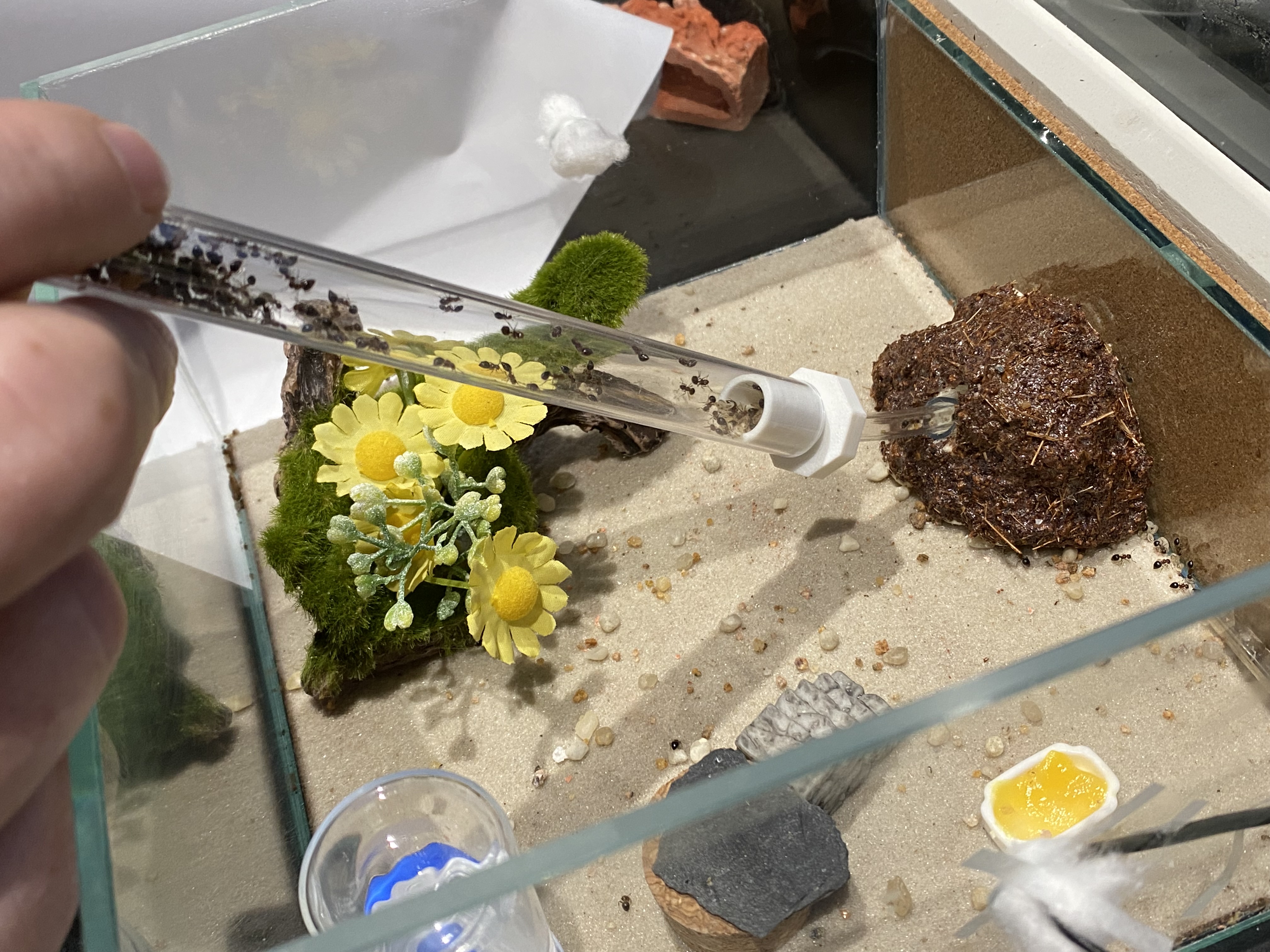 Bon, ok, aux grands maux les grands remèdes, j’ai effectué un déménagement ultra forcé, à savoir que j’ai récupéré la plupart de la population et du couvain (enfin, c’est mon mari qui a fait, avec une paille et un bout de collant au bout pour les aspirer doucement) et hop, mise en tube, pour enfin connecter le tube directement dans le nid.
