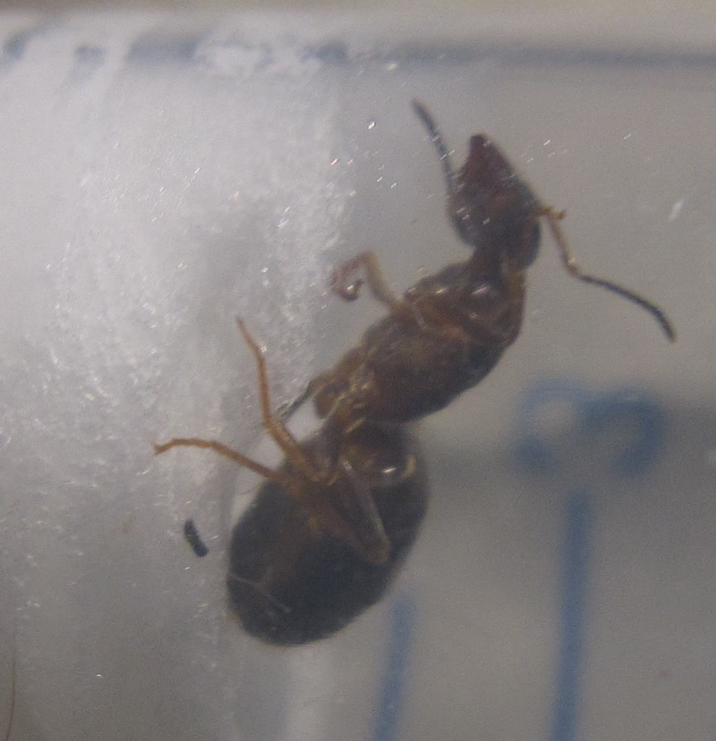 Voici les photos d'une gyne que je viens de trouver. Je n'étais pas le premier à la trouver car elle avait manifestement fait la rencontre d'une ouvrière noire d'une autre espèce et qui faisait la même taille (environ 9-10 mm - espèce inconnue de moi mais qui galope à une vitesse impressionnante, haute sur patte et d'allure féroce !). La gyne n'allait pas très bien et a fait une bonne partie du trajet sur le dos... Cela semble aller mieux ce soir mais on peut apercevoir sur la photo une patte qui a une forme ... baroque !