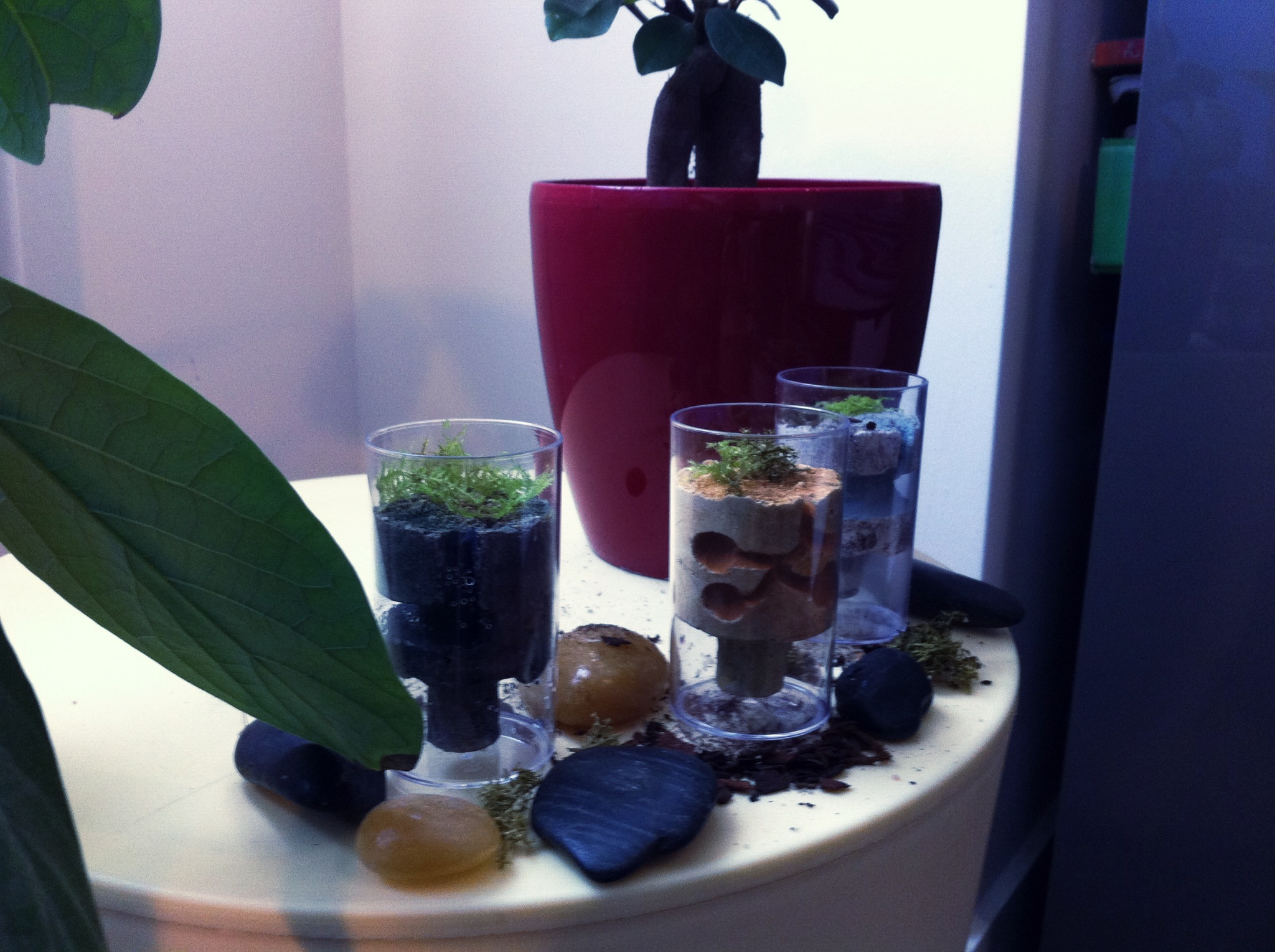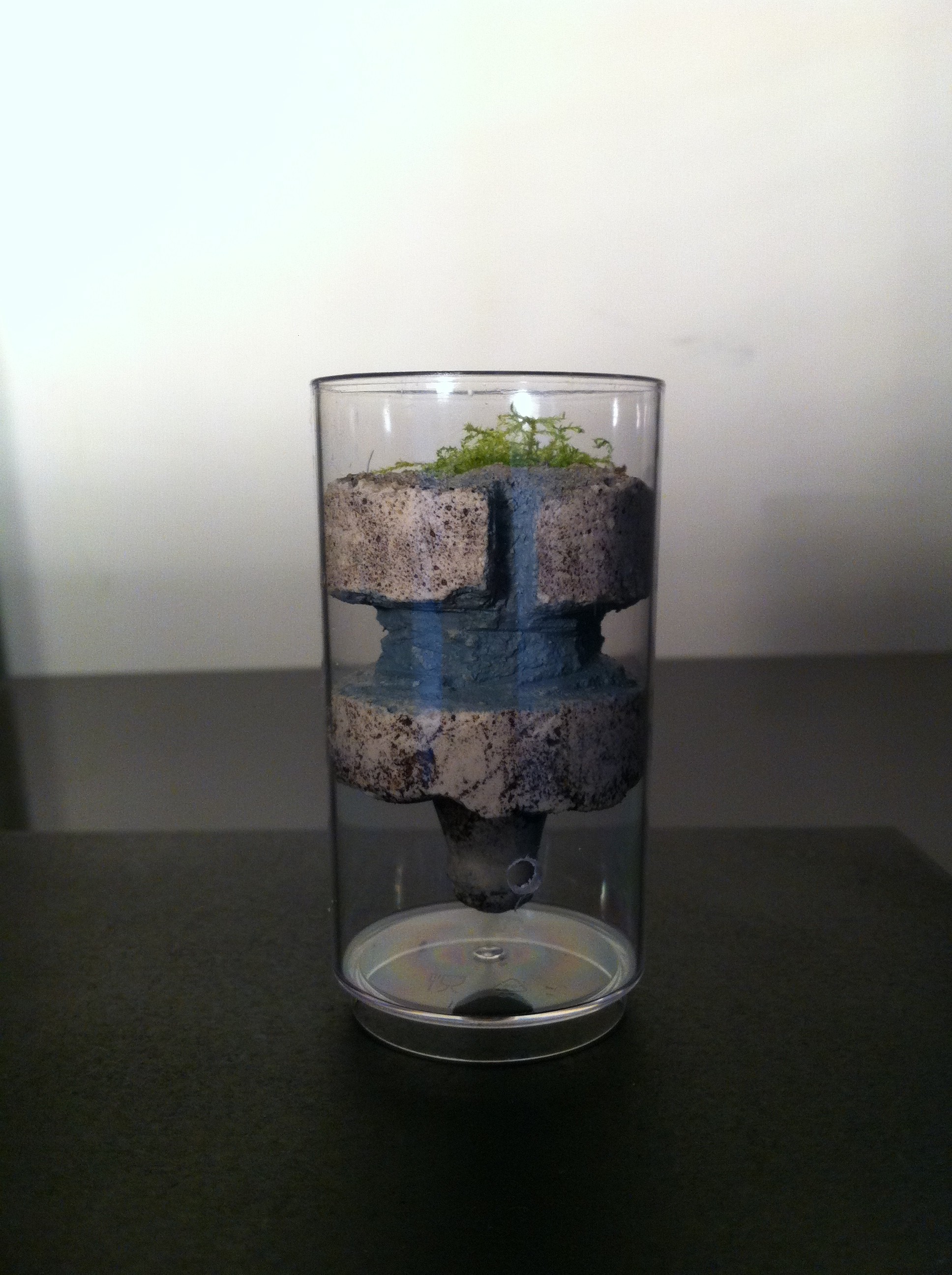 - Une vue sur les galeries teintées en bleu grisé taillées "vulgairement" exprès afin de donner un côté plus naturel à la réalisation. On constate que la mèche du système d'humidification est différemment conçue par rapport aux précédentes, sa forme en cône optimise la capillarisation et la réserve d'eau ne se vide pas d'un coup en asséchant le nid brutalement mais progressivement.