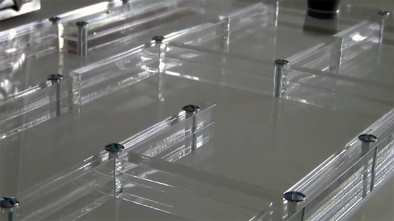 Il est composé de quatre plaques de 38x30cm. Une blanche de 3mm pour le fond, deux de 10mm pour les galeries et une dernière de 5mm transparente sur le dessus.