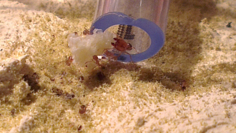 Pendant ce temps là, les ouvrières explorent l'aire de chasse, et cet après midi, elles ont trouvé une miette de brioche qu'elles tentent de ramener dans leur nid. A plusieurs et avec l'aide d'un soldat, elles finiront par la faire entrer dans le tube.