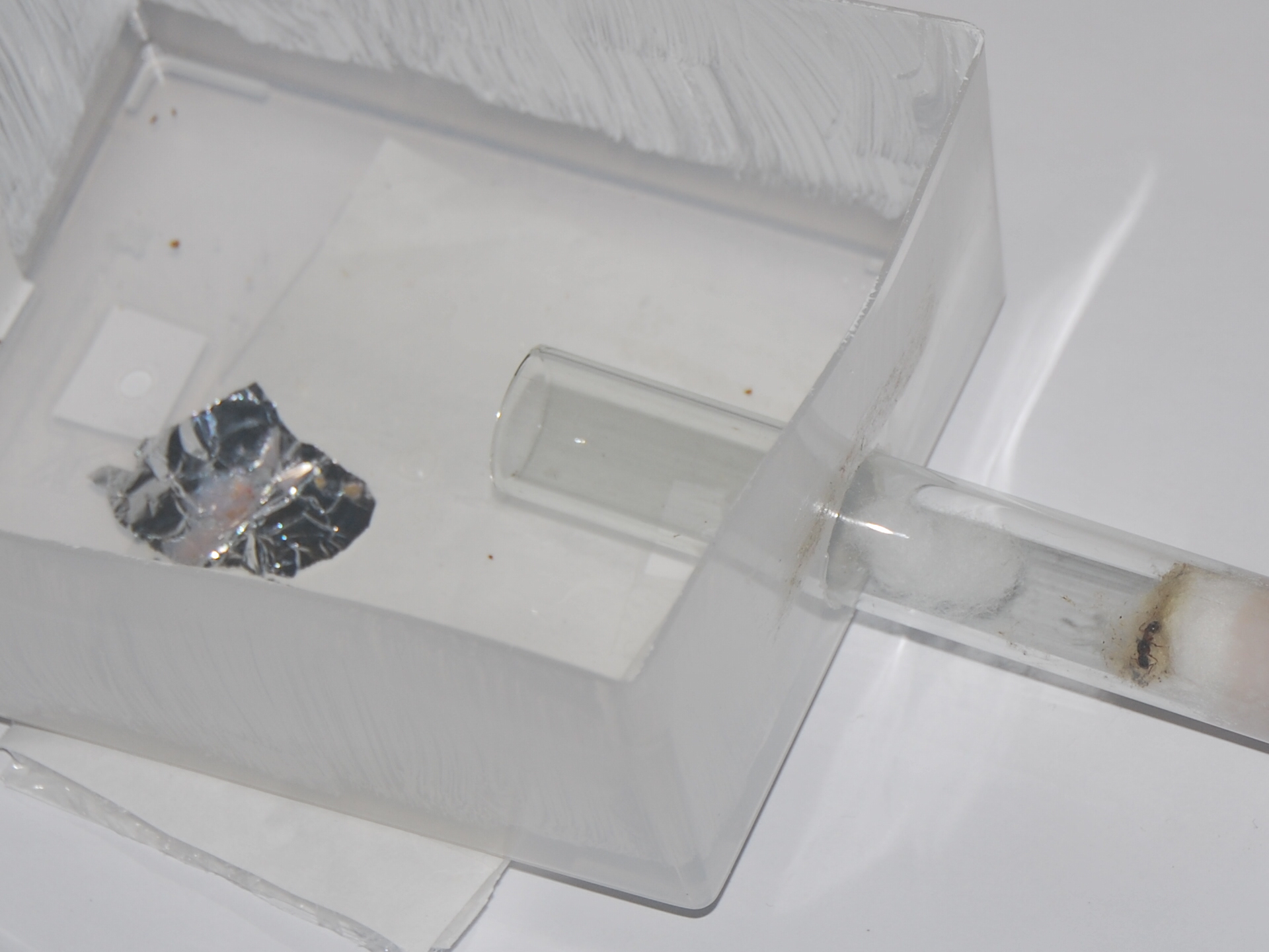 Remarquez le coton dans le tube entre l'ADF et le lieu où fondent les gynes. J'utilise le même procédé dans d'autres fondations en tubes sans ADF, ce coton sert à simuler la semi-claustralité dans un tube fermé (pour le moment ce procédé marche dans mes autres fondations qui ont vu apparaître des larves au bout de 4 semaines = à suivre dans la durée).
