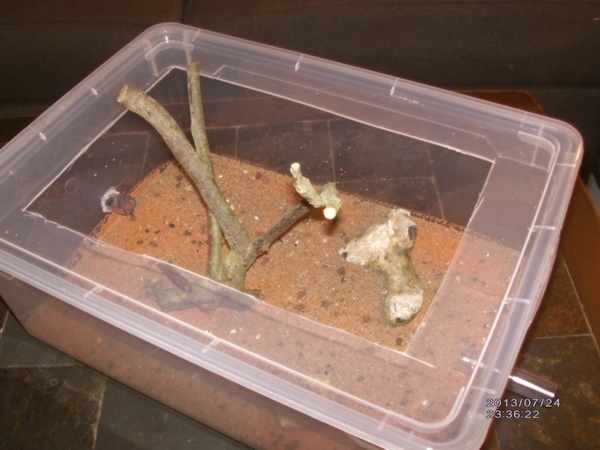 J'ai coulé dans le fond du plâtre mélangé à deux colorants, du rouge et du jaune. Quelques morceaux de roche volcanique achetés en jardinerie, un peu de sable et le tout saupoudré de "poudre de calcium", il s'agit en faite d'un sable trèèèès fin, acheté en animalerie. J'en mets toujours un peu pour un rendu final de faux sol sableux. Deux pierres trouvées au jardin, et un morceau de bois trouvé au jardin également. Tout ça placé sur le plâtre frais, rien ne bouge une fois sec.