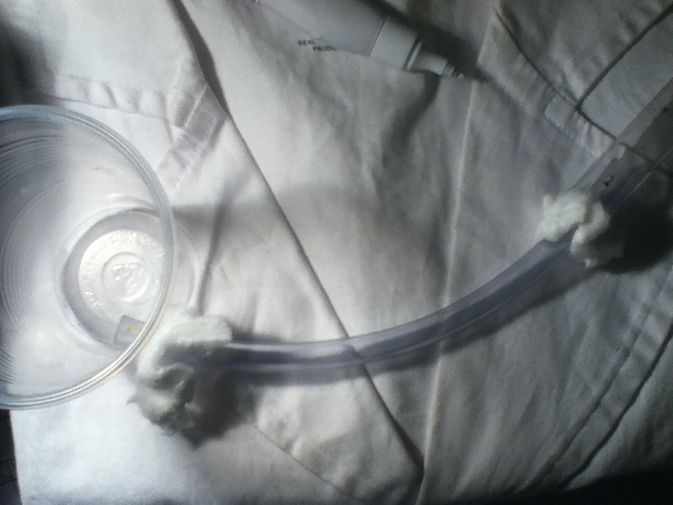 Désolé également de la qualité photo. On voit le tube de liaison qui relie le tube à essai au gobelet (pot de yaourt) avec du coton pour boucher les espaces.
