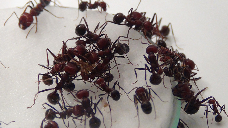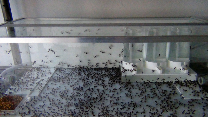 De toutes les colonies dont je m'occupe, dix en l'occurrence et quels que soient leurs effectifs respectifs, c'est assurément celle de mes Messor cephalotes qui me réclame une vigilance de tous les instants. D'aucuns penseraient qu'il suffit de leur jeter quelques graines et de leur laisser à disposition un simple abreuvoir. Il n'en est rien. Hormis le fait qu'elles consomment un nombre considérable de graines chaque semaine en regard de leur nombre, il me faut varier en permanence l'offre car il n'y a pas de règle... Dans le sens qu'elles sont extraordinairement capricieuses. Mes stocks se composent de douze types de graines différentes. Prenons le simple exemple du pissenlit. Ces fourmis l'adorent mais dès l'instant où il est proposé avec d'autres semences pourtant moins appréciées, il est boudé. Un autre cas m'a interpellé : si vous donnez de l'eau sucrée, elles se jetteront sur du simple blé alors qu'elles ne le regarderont même pas avec de l'eau dépourvue de sucre. Les exemples sont si nombreux qu'ils m'obligent continuellement à modifier leur régime alimentaire. Seul leur appétit pour mes dodues Blatta lateralis semble la constante : sept à huit chaque jour. La colonie ne semble d'ailleurs pas avoir de limite à ce propos, des proies qu'elles chassent telles des "énergumènes".