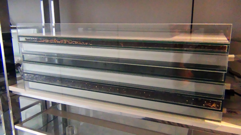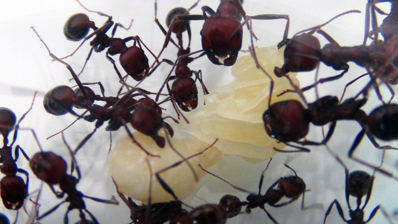 Que dire aussi de cette propension qu'à la reine à sortir de son cocon de verre chaque nuit pour aller boire le coton imbibé que je mets continuellement à leur disposition ou bien encore ces nombreuses ouvrières en furie, qui, à la moindre contrariété se mettent à gravir avec succès les parois de verre de l'aquarium faisant fi de l'anti-évasion appliqué ! Mais à ces comportements déroutants s'ajoute leurs différentes attitudes expertes en regard des graines proposées, graines qu'elles déplacent, trient inlassablement voire simplement rejettent... un temps. Pourquoi... mais pourquoi donc certains de mes major s'évertuent à "jeter à terre" les bouchons de caoutchouc cloisonnant leur nid une fois la semaine pas plus ou bien la nuitée venue je les vois s'enfuir je ne sais où avec une nymphe pour finalement revenir sur leurs pas ? Ces attitudes inhabituelles me passionnent et éveillent en moi curiosité et fascination pour le genre.