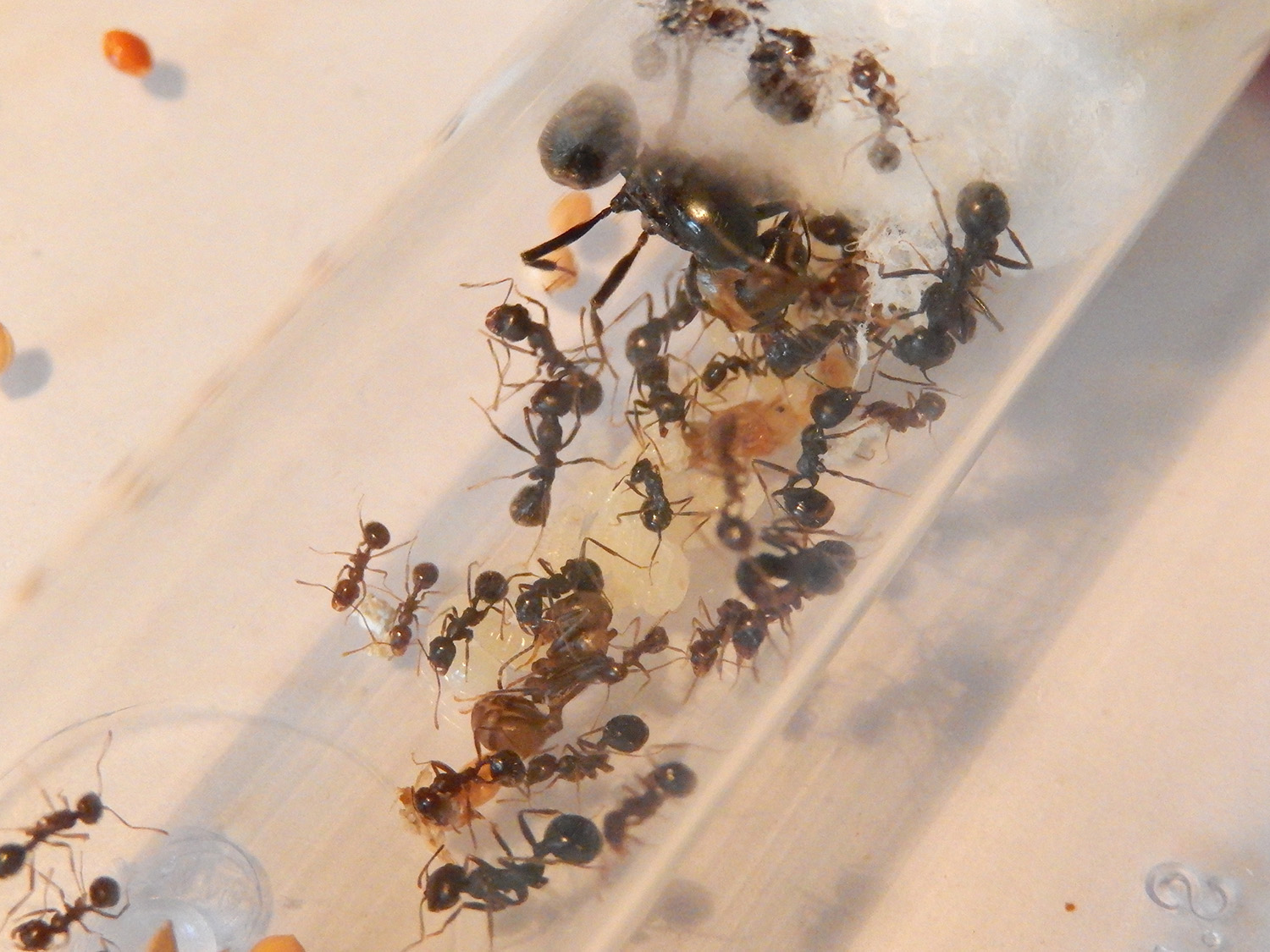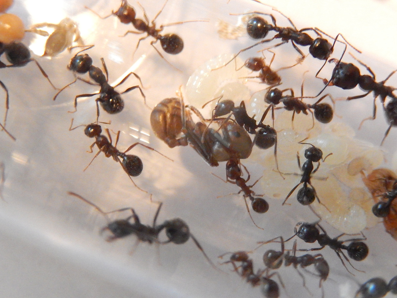 Je ne dénombre qu'une morte depuis mon dernier post ! Elles sont toujours chauffées à 28°C et nourries avec une vingtaine de graines différentes, du pseudo miellat et des insectes...