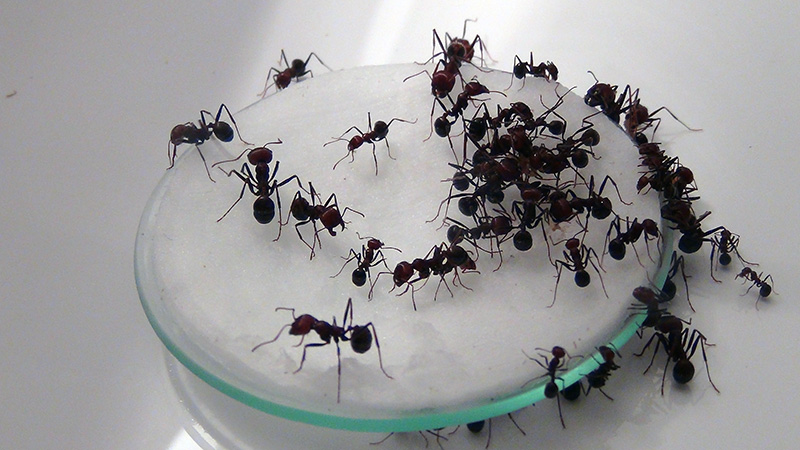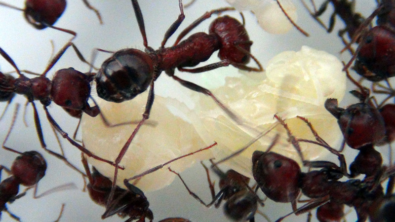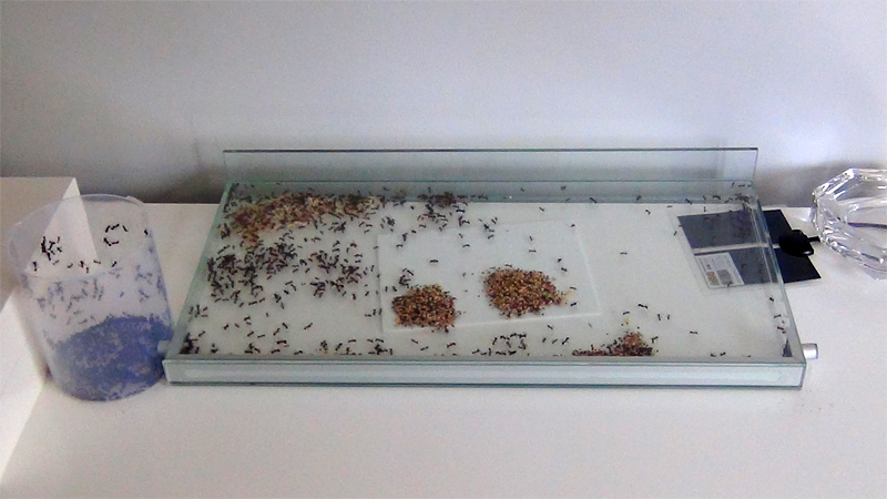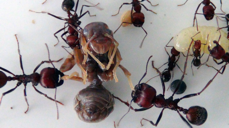 Que dire aussi de cette propension qu'à la reine à sortir de son cocon de verre chaque nuit pour aller boire le coton imbibé que je mets continuellement à leur disposition ou bien encore ces nombreuses ouvrières en furie, qui, à la moindre contrariété se mettent à gravir avec succès les parois de verre de l'aquarium faisant fi de l'anti-évasion appliqué ! Mais à ces comportements déroutants s'ajoute leurs différentes attitudes expertes en regard des graines proposées, graines qu'elles déplacent, trient inlassablement voire simplement rejettent... un temps. Pourquoi... mais pourquoi donc certains de mes major s'évertuent à "jeter à terre" les bouchons de caoutchouc cloisonnant leur nid une fois la semaine pas plus ou bien la nuitée venue je les vois s'enfuir je ne sais où avec une nymphe pour finalement revenir sur leurs pas ? Ces attitudes inhabituelles me passionnent et éveillent en moi curiosité et fascination pour le genre.