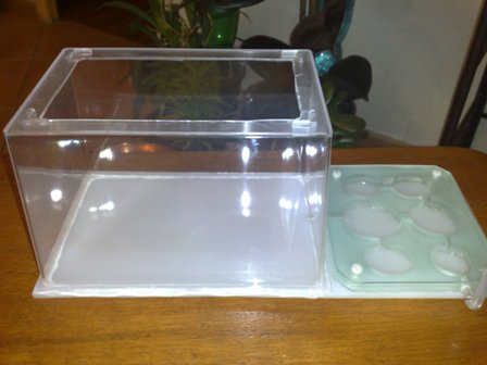 - Pour l’aire de fourragement j’utilise un bac de type cuve pour poisson rouge. Disponible dans toute animalerie pour une somme modique (3 ou 4€). Le plus dur étant de trouver un modèle le plus simple possible avec les bords droits et vendu sans couvercle. Les aquariophiles ont tendance à vendre des modèles sophistiqués, colorés, et sans intérêt mais beaucoup plus chers !