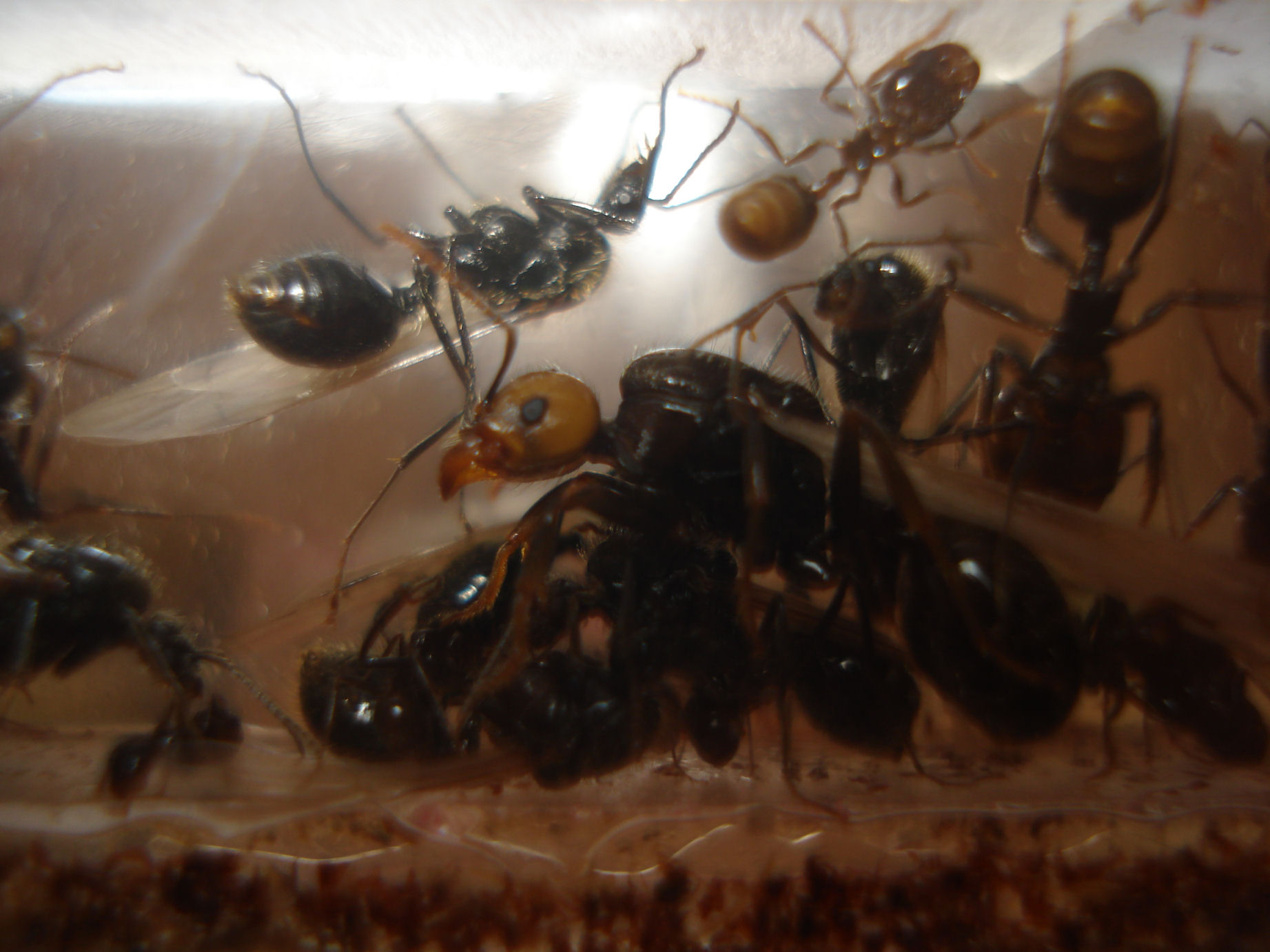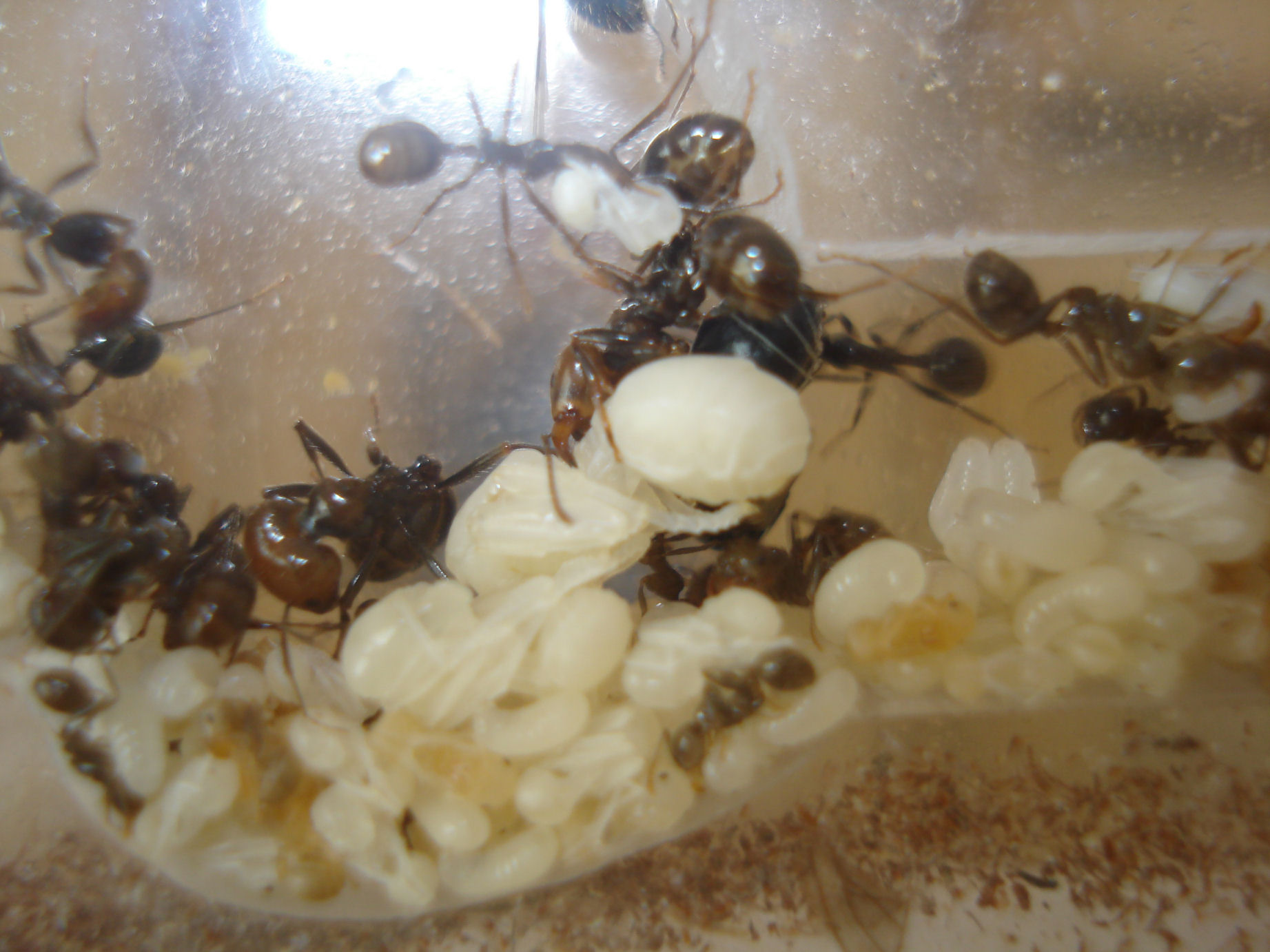 La colonie qui me reste, la 3ème il me semble se porte bien, il y a désormais une dizaine d'ouvrières première génération, 4 cocons autant de nymphes nues et une belle grappe d'œufs et de larves au stade L1.