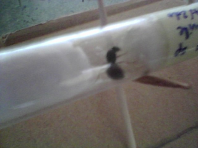 Après un nettoyage intensif du tube et re-remplissage de la réserve d'eau, j'ai remis la gyne en place puis je lui ai donné un morceau de jambon blanc pour les protéines. J'espère qu'elle va vite pondre de nouveaux œufs. Pour l'instant, elle mange le jambon et est très calme, elle n'a pas l'air d'avoir trop stressé.